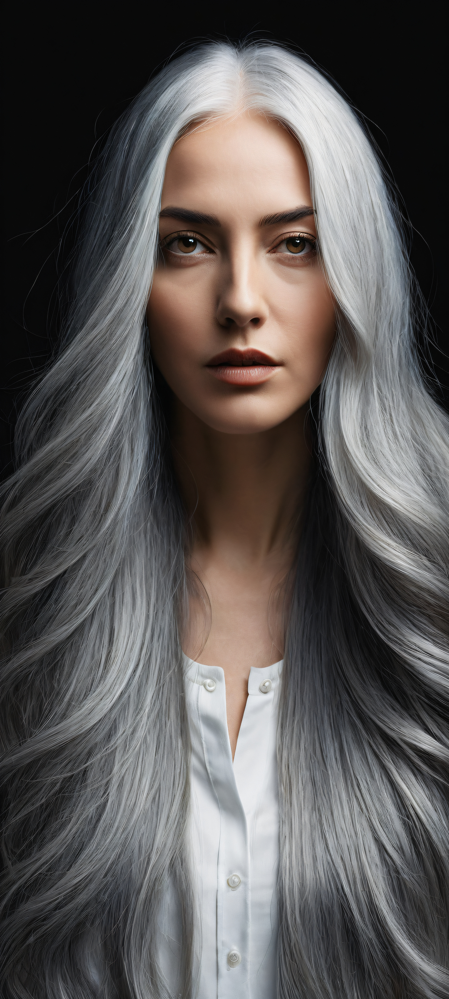 A breathtaking vertical portrait artwork of A woman with long, flowing grey hair placed in the lower-middle with insane micro-details. Extreme depth of field., Perfectly clean and empty top half with vast pure void, allowing for seamless UI integration. Bottom half showcases a minimalist background emphasizing the subject., Award-winning digital art, stunning visual impact, and pristine clarity. Inspired by Apple UI level., Sleek dark mode aesthetic featuring deep perfect blacks, striking crisp contrast, and elegant luminescent accents creating an immersive experience., #333 (Grey-Black) as the primary color with subtle white and silver accents to add depth and sophistication., elegant low-key lighting, deep perfect blacks, striking contrast, sleek dark mode aesthetic, luminescent accents, deep rich colors, portrait composition, centered subject in the lower middle, perfectly clean and smooth top half for UI, extreme depth of field blurred background, highly textured surfaces, intricate micro-details, physically based rendering, award-winning digital art, epic breathtaking scale, stunning visual impact, perfect composition, macOS wallpaper aesthetic, masterpiece, 2K QHD resolution, 9:20 aspect ratio.