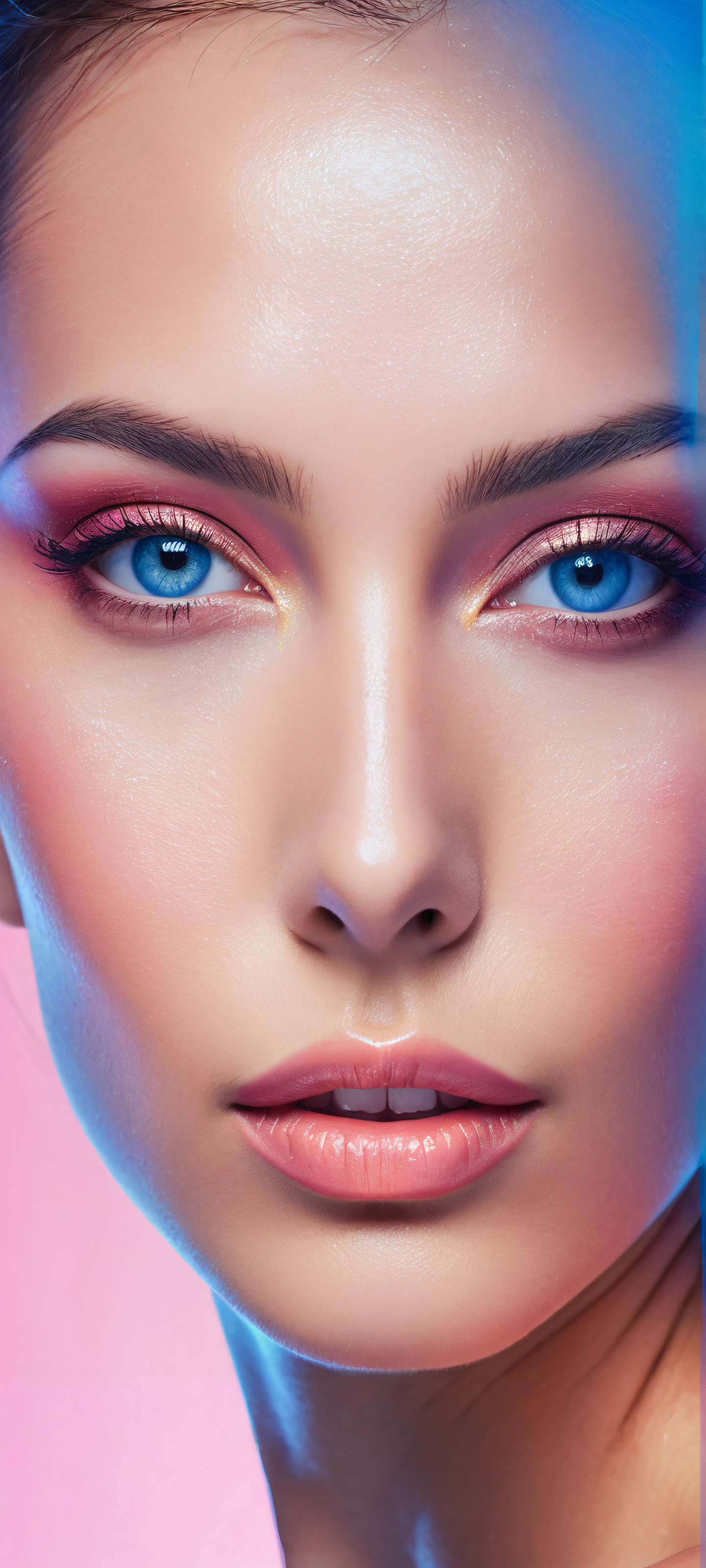 A breathtaking vertical portrait artwork of A detailed face with intricate micro-details placed in the lower-middle, showcasing insane expression and realistic features., Perfectly clean and empty top half with vast pure void, seamlessly transitioning into a futuristic cityscape in the bottom half., Award-winning digital art, pristine clarity, blending organic and synthetic elements with stunning visual impact., Ethereal lighting illuminates the subject from beneath, casting an otherworldly glow with subtle ray traced reflections., Dominant color palette of deep blues (#032B44) and neon pinks (#FF69B4), evoking a sense of futuristic mystique and wonder., ethereal lighting, radiant, brilliant colors, ray traced reflections, pristine clarity, portrait composition, centered subject in the lower middle, perfectly clean and smooth top half for UI, extreme depth of field blurred background, highly textured surfaces, intricate micro-details, physically based rendering, award-winning digital art, epic breathtaking scale, stunning visual impact, perfect composition, macOS wallpaper aesthetic, masterpiece, 2K QHD resolution, 9:20 aspect ratio.