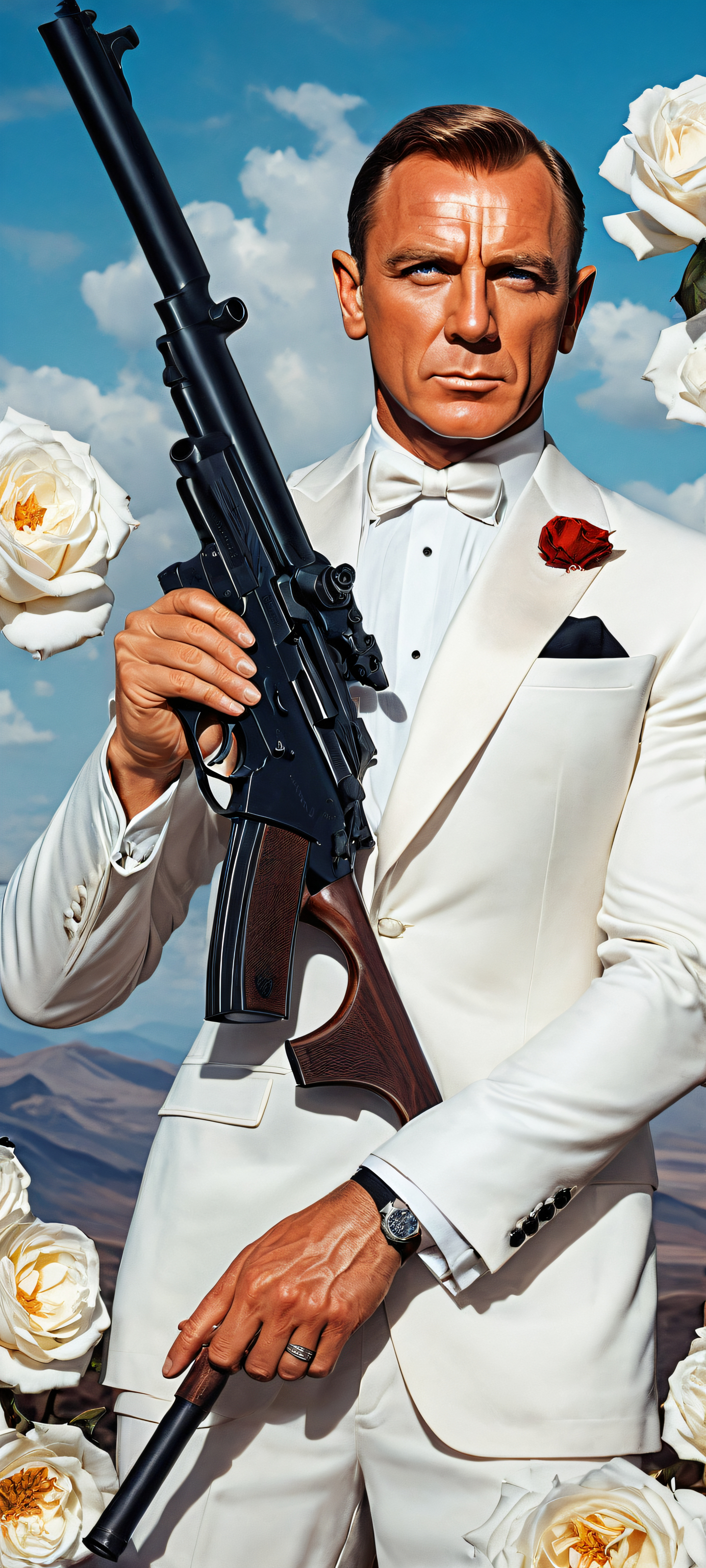 A breathtaking vertical portrait artwork of James Bond placed in the lower-middle with intricate micro-details of a sci-fi Makarov pistol in hand and Jana Fleming’s iconic phrase ‘The name is Bond, James Bond’ from the book cover, while the companion model from picture 1 has replaced the original female figure from picture 2, A perfectly clean and empty top half with a vast pure void, allowing for seamless UI integration, while the bottom half features a dramatic backdrop of okrovetty white roses, a scythe, and a hammer, symbolizing the Soviet Union’s iconic imagery, Award-winning digital art, pristine clarity, echoing the cinematic grandeur of a Bond film, Ethereal lighting with radiant, brilliant colors, ray-traced reflections, and pristine clarity, bathing the entire scene in an otherworldly glow, Dominant color palette of deep reds, blues, and silvers, evoking the mystery and intrigue of a Bond film, ethereal lighting, radiant, brilliant colors, ray traced reflections, pristine clarity, portrait composition, centered subject in the lower middle, perfectly clean and smooth top half for UI, extreme depth of field blurred background, highly textured surfaces, intricate micro-details, physically based rendering, award-winning digital art, epic breathtaking scale, stunning visual impact, perfect composition, macOS wallpaper aesthetic, masterpiece, 2K QHD resolution, 9:20 aspect ratio.