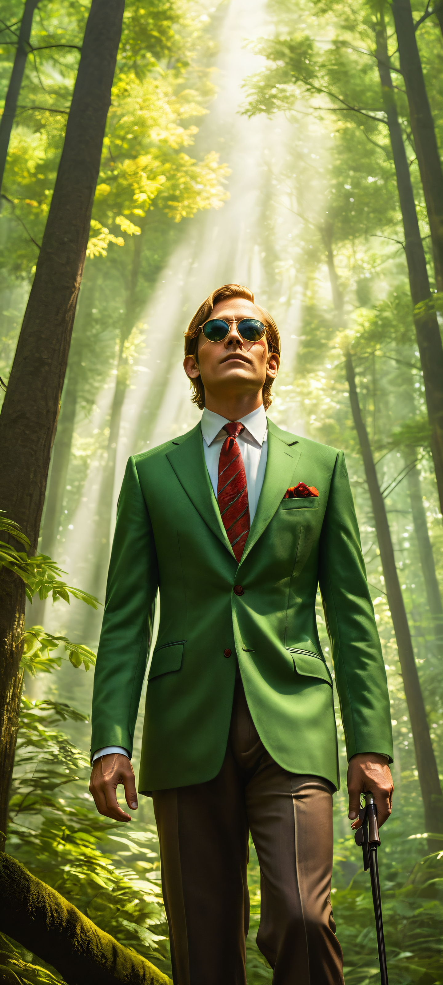 A breathtaking vertical portrait artwork of Link placed in the lower-middle, intricate micro-details of his pinstripe suit and sunglasses, Perfectly clean and empty top half with vast pure void, vast forest canopy below with Skull Kids peeking from behind trees, Award-winning digital art, stunning visual impact with a touch of surrealism, pristine clarity, Ethereal lighting: shafts of mysterious green light beam through the forest canopy, casting dramatic light over this absurdly shady transaction, Dominant color palette: earthy tones (green, brown) with pops of bold colors (red, yellow) for a whimsical and suspicious vibe, ethereal lighting, radiant, brilliant colors, ray traced reflections, pristine clarity, portrait composition, centered subject in the lower middle, perfectly clean and smooth top half for UI, extreme depth of field blurred background, highly textured surfaces, intricate micro-details, physically based rendering, award-winning digital art, epic breathtaking scale, stunning visual impact, perfect composition, macOS wallpaper aesthetic, masterpiece, 2K QHD resolution, 9:20 aspect ratio.