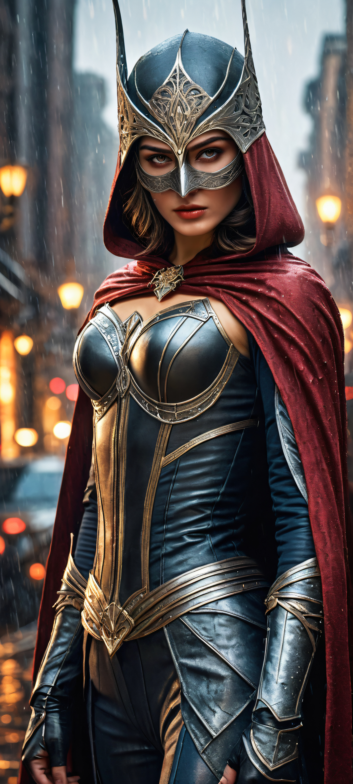 A breathtaking vertical portrait artwork of A masked heroine placed in the lower-middle with intricate micro-details of small natural breasts and sagging breasts, her hand resting on her rapier in the scabbard., Perfectly clean and empty top half with vast pure void, gradually transitioning to a rainy cityscape in the lower half., Award-winning digital art with stunning visual impact, showcasing a masterpiece of flawless precision., Ethereal lighting with radiant raindrops reflecting off the heroine’s cape and hat, accompanied by brilliant colors and ray-traced reflections., #3498DB #F7D2C4, ethereal lighting, radiant, brilliant colors, ray traced reflections, pristine clarity, portrait composition, centered subject in the lower middle, perfectly clean and smooth top half for UI, extreme depth of field blurred background, highly textured surfaces, intricate micro-details, physically based rendering, award-winning digital art, epic breathtaking scale, stunning visual impact, perfect composition, macOS wallpaper aesthetic, masterpiece, 2K QHD resolution, 9:20 aspect ratio.