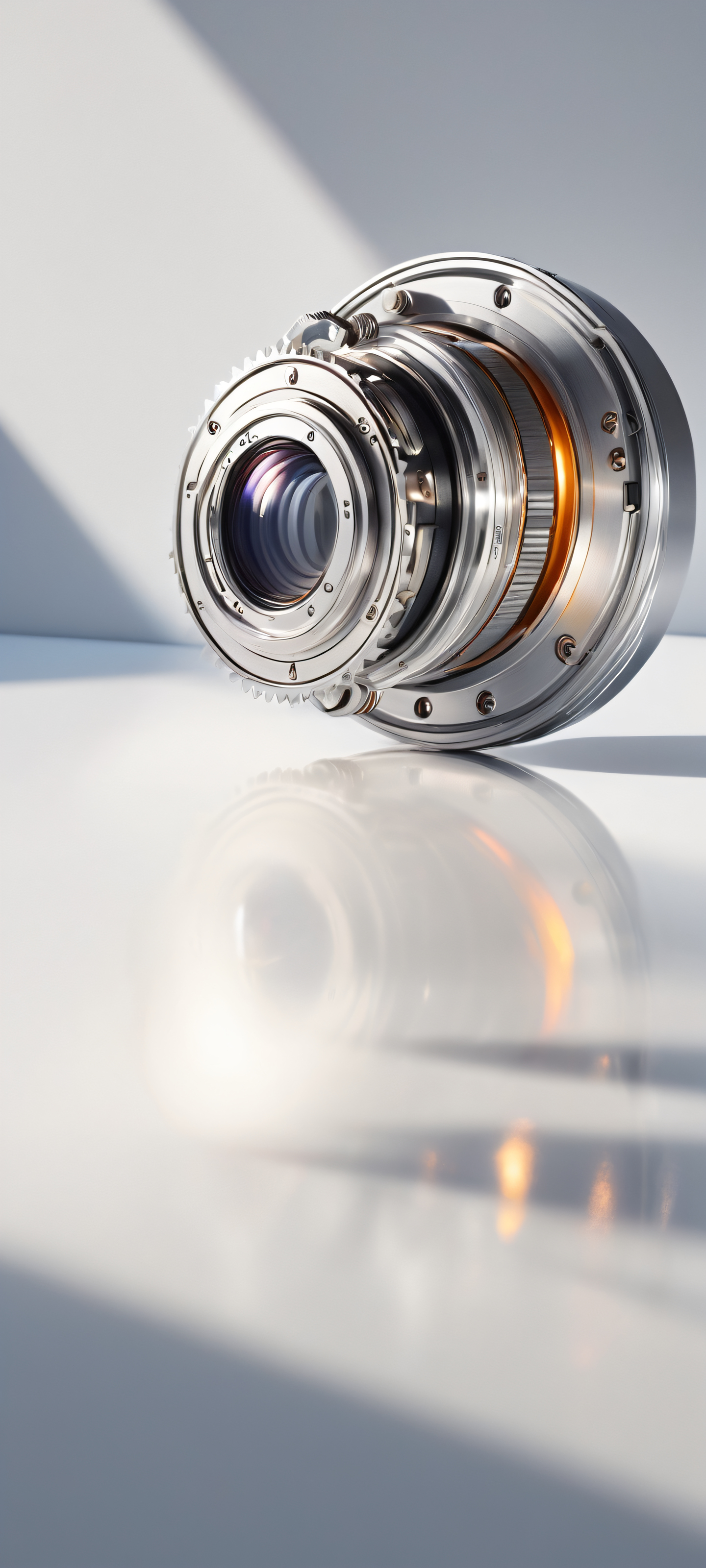 A breathtaking vertical portrait artwork of Minimalist Gear placed in the lower-middle with insane micro-details, Perfectly clean and empty top half with vast pure void, against a backdrop of subtle gradient shadows, Award-winning digital art, pristine clarity, and stunning visual impact, Ethereal Lighting: Soft, radiant glow illuminating the subject from above, with faint reflections on metallic surfaces, #333, ethereal lighting, radiant, brilliant colors, ray traced reflections, pristine clarity, portrait composition, centered subject in the lower middle, perfectly clean and smooth top half for UI, extreme depth of field blurred background, highly textured surfaces, intricate micro-details, physically based rendering, award-winning digital art, epic breathtaking scale, stunning visual impact, perfect composition, macOS wallpaper aesthetic, masterpiece, 2K QHD resolution, 9:20 aspect ratio.
