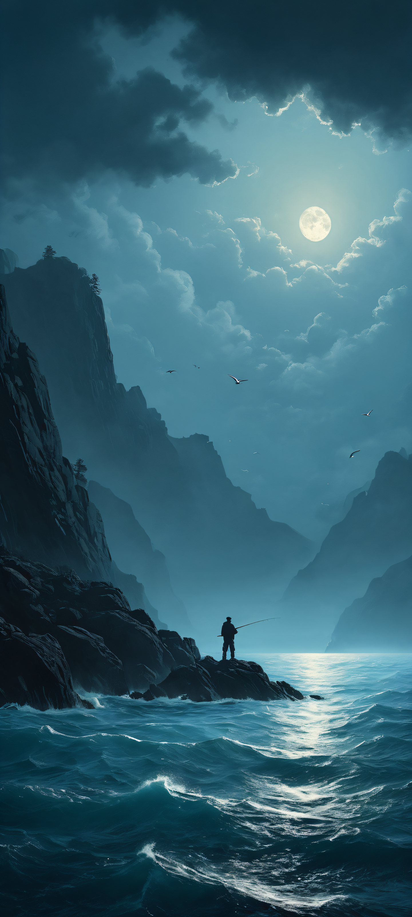 A breathtaking vertical portrait artwork of A lone fisherman placed in the lower-middle, intricate micro-details of his frantic struggle to reach for a flare gun amidst a vast oceanic backdrop., The scene unfolds against a perfectly clean and empty top half with a vast pure void, creating a sense of contemplation., Award-winning digital art, pristine clarity and elegance, paying homage to Ivan Aivazovsky’s misty atmosphere and emotional scale., Deep perfect blacks dominate the background, while striking crisp contrast highlights the fisherman’s despair, punctuated by elegant luminescent accents on the flare gun., Dominant palette features soft blues and greys, evoking melancholy and the eerie calmness of a moonlit ocean night., elegant low-key lighting, deep perfect blacks, striking contrast, sleek dark mode aesthetic, luminescent accents, deep rich colors, portrait composition, centered subject in the lower middle, perfectly clean and smooth top half for UI, extreme depth of field blurred background, highly textured surfaces, intricate micro-details, physically based rendering, award-winning digital art, epic breathtaking scale, stunning visual impact, perfect composition, macOS wallpaper aesthetic, masterpiece, 2K QHD resolution, 9:20 aspect ratio.