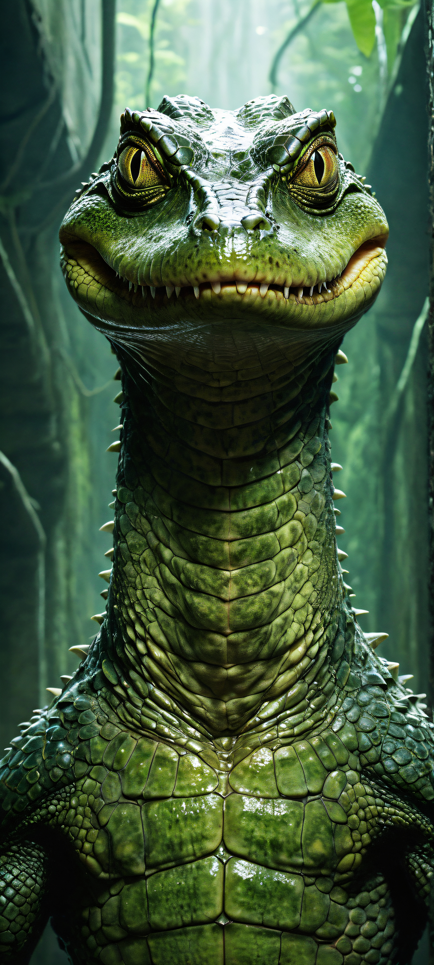 A breathtaking vertical portrait artwork of A heavily mutated human-alligator hybrid placed in the lower-middle, intricate micro-details, showcasing its armored scales and patchy human-like skin around the face and torso., A perfectly clean and empty top half with vast pure void, transitioning to a massive concrete sewer tunnel with moss-covered walls and dripping pipes in the lower-half., Award-winning digital art, pristine clarity, and an unparalleled level of visual impact, reminiscent of Apple UI design, Ethereal lighting, radiating brilliant colors and ray-traced reflections, illuminating the subject from within, while ambient light casts an eerie glow on the environment, [‘Sickly green-gray’, ‘Dark gray-green’, ‘Faint yellow luminescence’], ethereal lighting, radiant, brilliant colors, ray traced reflections, pristine clarity, portrait composition, centered subject in the lower middle, perfectly clean and smooth top half for UI, extreme depth of field blurred background, highly textured surfaces, intricate micro-details, physically based rendering, award-winning digital art, epic breathtaking scale, stunning visual impact, perfect composition, macOS wallpaper aesthetic, masterpiece, 2K QHD resolution, 9:20 aspect ratio.