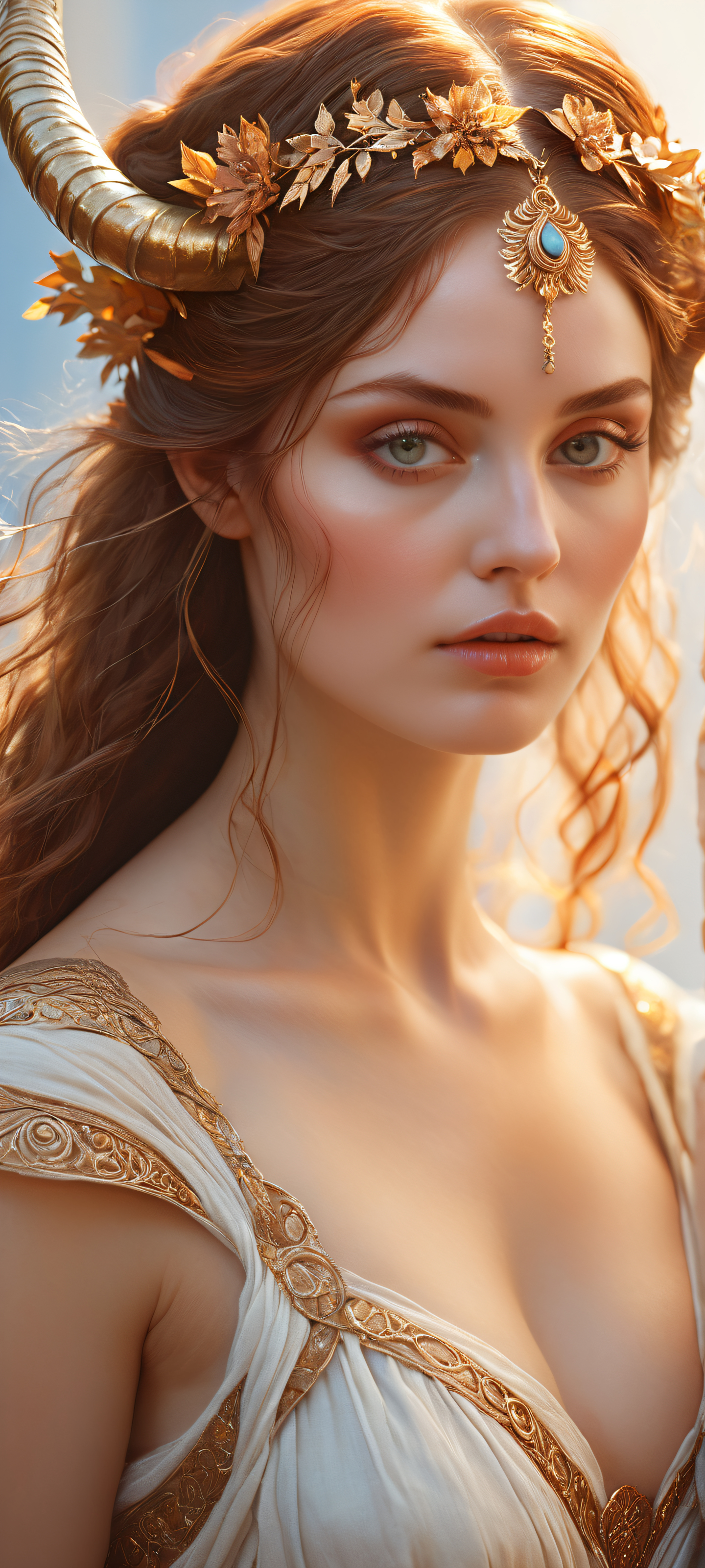 This breathtaking vertical portrait artwork is perfectly optimized for your iPhone, Samsung Galaxy, oder Android-Startbildschirm. The majestic horns and flowing brown locks of the mystical maiden captivate the viewer’s attention, while the pristine clarity and stunning visual impact transport you to a Renaissance-inspired masterpiece.