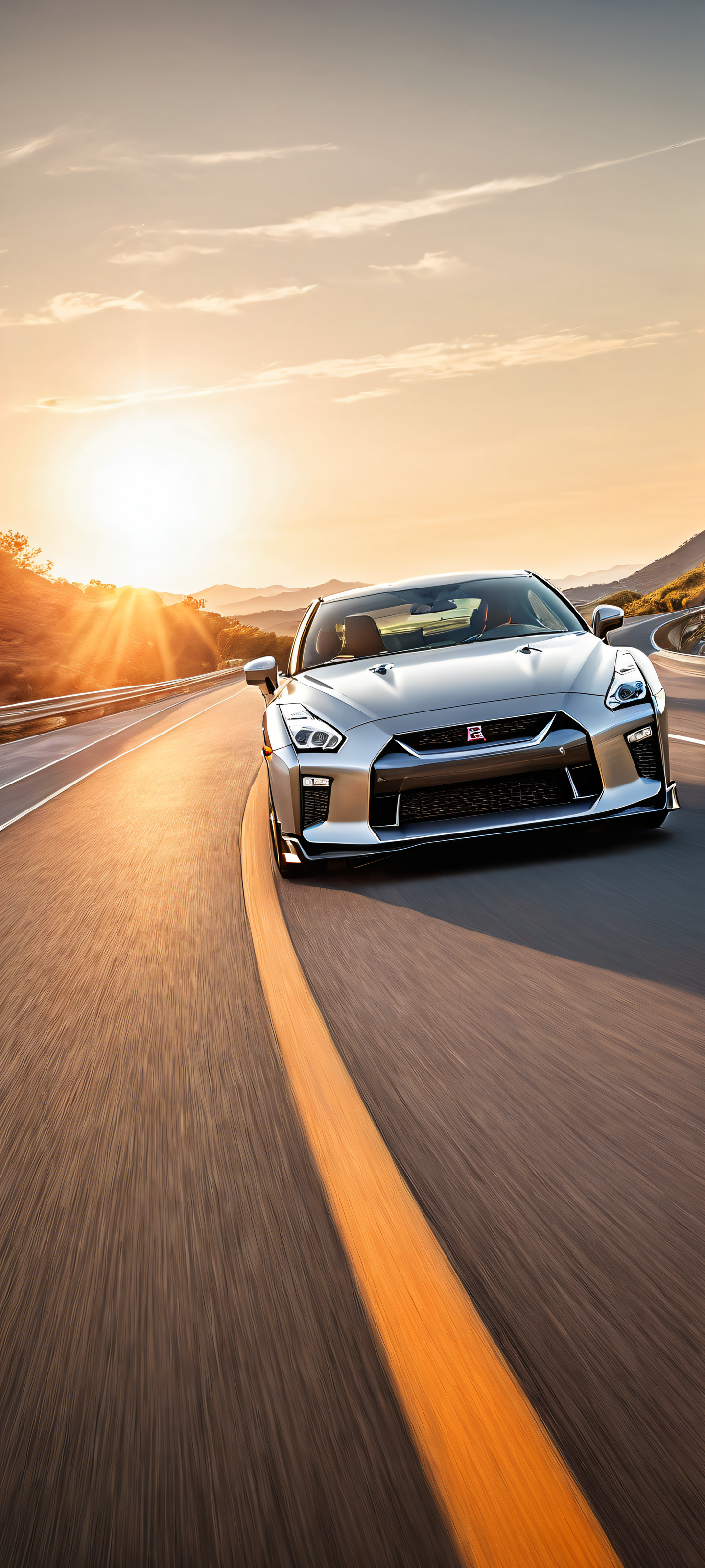 A breathtaking vertical portrait artwork of A Nissan GT-R placed in the lower-middle with intricate micro-details such as dynamic speed gauges and high-tech dashboard elements., Perfectly clean and empty top half with vast pure void, giving way to a vast, winding road that stretches out into the distance in 16:9 aspect ratio, Award-winning digital art with pristine clarity, showcasing the vehicle’s sleek design and motion blur effects, reminiscent of a video game screenshot., Ethereal sunlight casting a warm glow on the vehicle’s sleek surfaces, with subtle ray traced reflections adding depth and dimensionality., #F7D2C4 #3498DB #FFC107 #333333, ethereal lighting, radiant, brilliant colors, ray traced reflections, pristine clarity, portrait composition, centered subject in the lower middle, perfectly clean and smooth top half for UI, extreme depth of field blurred background, highly textured surfaces, intricate micro-details, physically based rendering, award-winning digital art, epic breathtaking scale, stunning visual impact, perfect composition, macOS wallpaper aesthetic, masterpiece, 2K QHD resolution, 9:20 aspect ratio.
