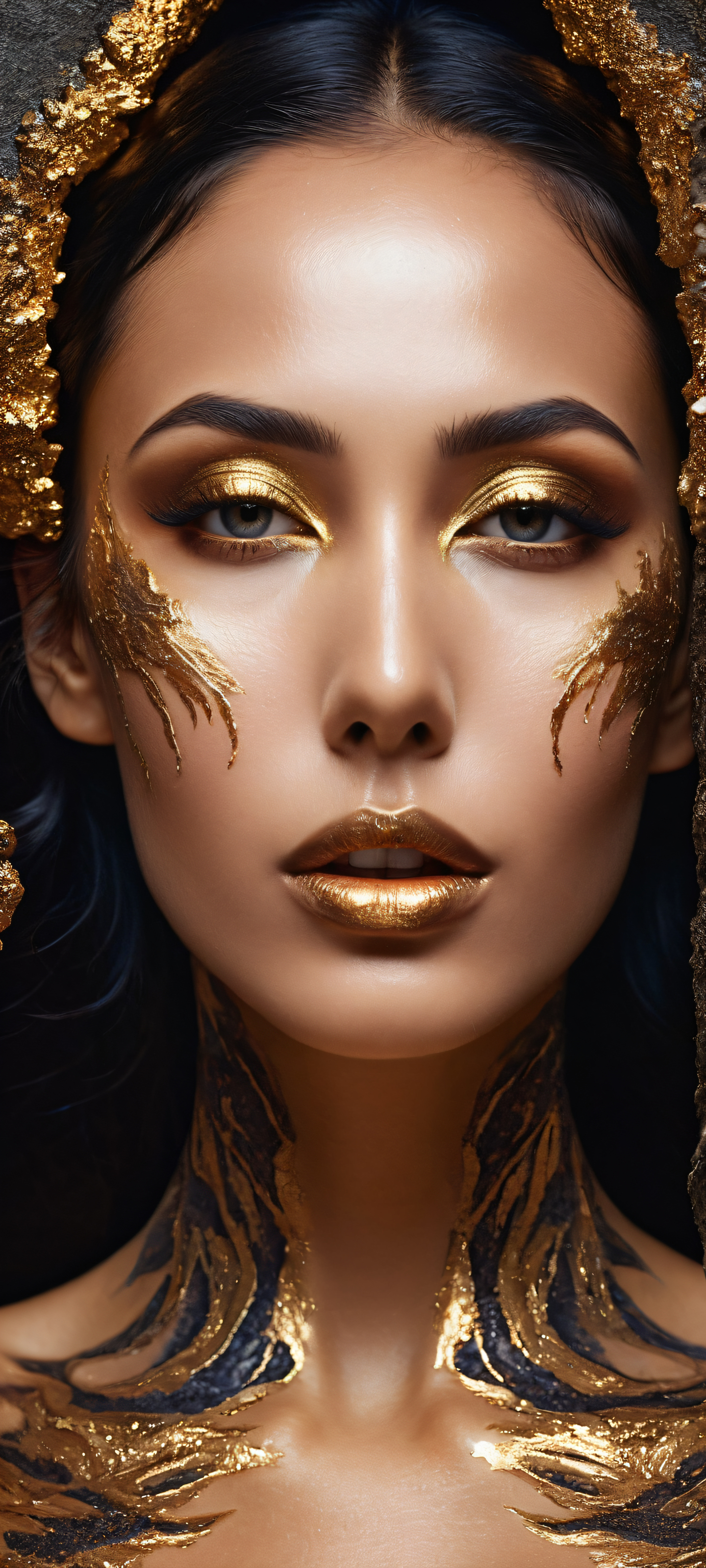 A breathtaking vertical portrait artwork of A woman with skin like polished obsidian, placed in the lower-middle with intricate micro-details of cracks of glowing molten gold spreading across her face like living veins., Perfectly clean and empty top half with vast pure void, while the bottom half is a surreal realm of swirling black petals that dissolve into smoke, Award-winning digital art, pristine clarity, and stunning visual impact reminiscent of Apple UI level, Soft rim lighting with deep shadows, evoking an ethereal glow that radiates from within, Dominant palette of dark blues and purples, punctuated by bursts of molten gold and starlight-like highlights, ethereal lighting, radiant, brilliant colors, ray traced reflections, pristine clarity, portrait composition, centered subject in the lower middle, perfectly clean and smooth top half for UI, extreme depth of field blurred background, highly textured surfaces, intricate micro-details, physically based rendering, award-winning digital art, epic breathtaking scale, stunning visual impact, perfect composition, macOS wallpaper aesthetic, masterpiece, 2K QHD resolution, 9:20 aspect ratio.