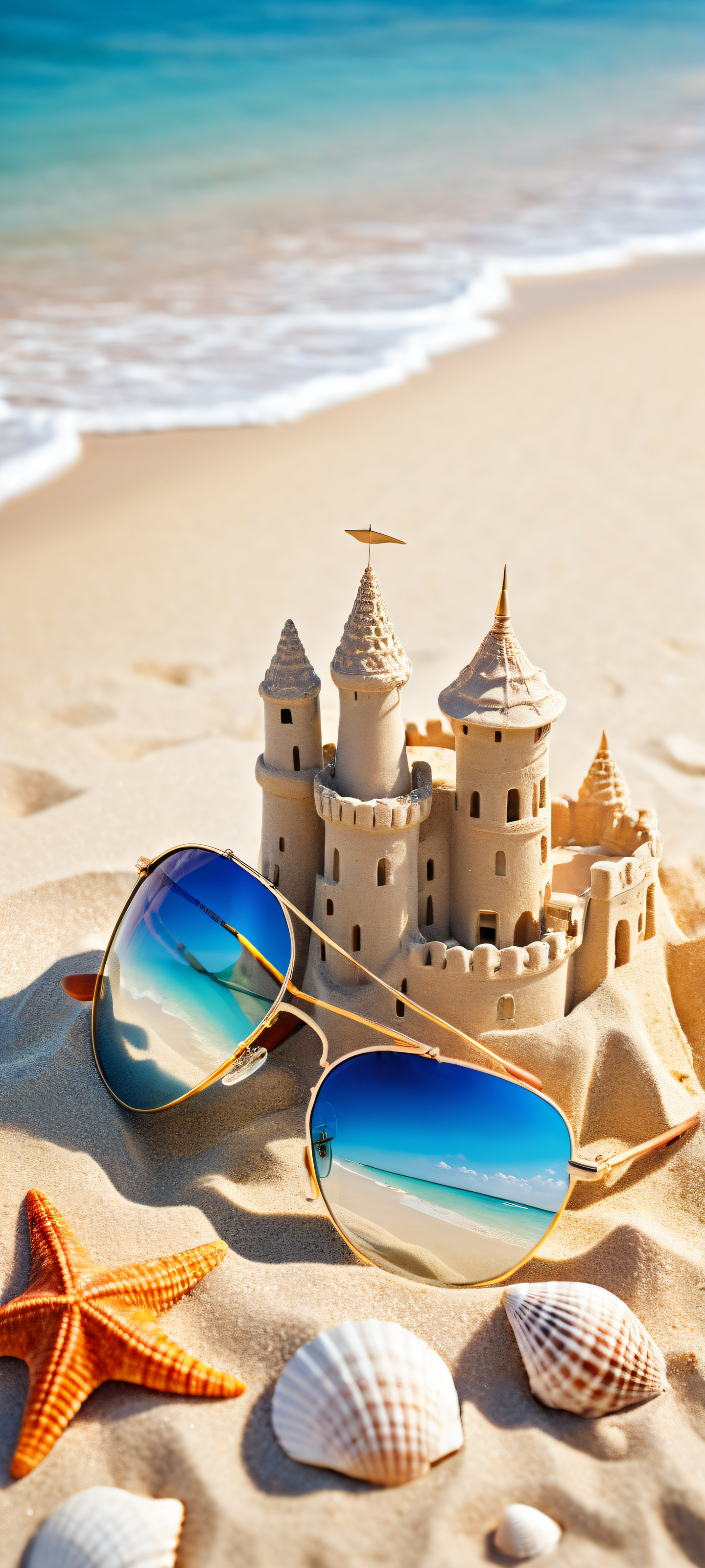 A breathtaking vertical portrait artwork of Sand castle placed in the lower-middle, intricate micro-details of toys and seashells., Perfectly clean and empty top half with vast pure void, descending into a breathtaking beach scene with sandy dunes and blue waters., Award-winning digital art, stunning visual impact with 8k resolution and 16:9 aspect ratio, pristine clarity., Ethereal softbox lighting with warm, radiant colors, capturing the essence of a sunny summer day. Ray-traced reflections on sunglasses and seashells add depth and visual interest., Dominant palette of calming blues (#4567b7), sandy neutrals (#f5f5f5), and pops of bright white (#ffffff) evoking feelings of serenity and joy., ethereal lighting, radiant, brilliant colors, ray traced reflections, pristine clarity, portrait composition, centered subject in the lower middle, perfectly clean and smooth top half for UI, extreme depth of field blurred background, highly textured surfaces, intricate micro-details, physically based rendering, award-winning digital art, epic breathtaking scale, stunning visual impact, perfect composition, macOS wallpaper aesthetic, masterpiece, 2K QHD resolution, 9:20 aspect ratio.