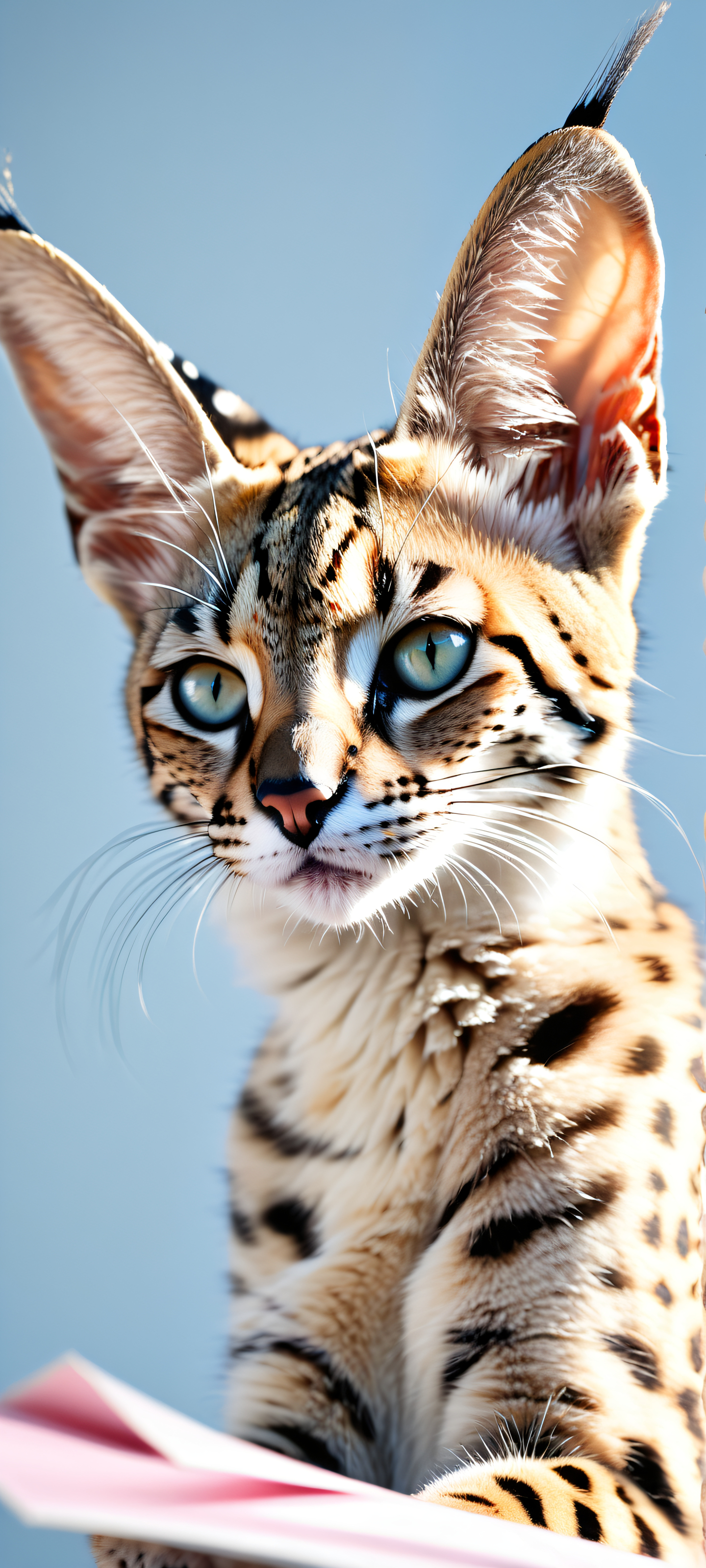 A breathtaking vertical portrait artwork of Serval holding a sign with letter ‘?’ on it placed in the lower-middle, intricate micro-details, Perfectly clean and empty top half with vast pure void, and a white background that extends below the subject to create a sense of depth, Award-winning digital art, stunning visual impact, and pristine clarity, Ethereal lighting with radiant colors, ray-traced reflections, and bright, airy quality that creates a sense of happiness and curiosity, Pastel colors such as pale pink, baby blue, and creamy white that evoke feelings of cuteness and innocence, ethereal lighting, radiant, brilliant colors, ray traced reflections, pristine clarity, portrait composition, centered subject in the lower middle, perfectly clean and smooth top half for UI, extreme depth of field blurred background, highly textured surfaces, intricate micro-details, physically based rendering, award-winning digital art, epic breathtaking scale, stunning visual impact, perfect composition, macOS wallpaper aesthetic, masterpiece, 2K QHD resolution, 9:20 aspect ratio.