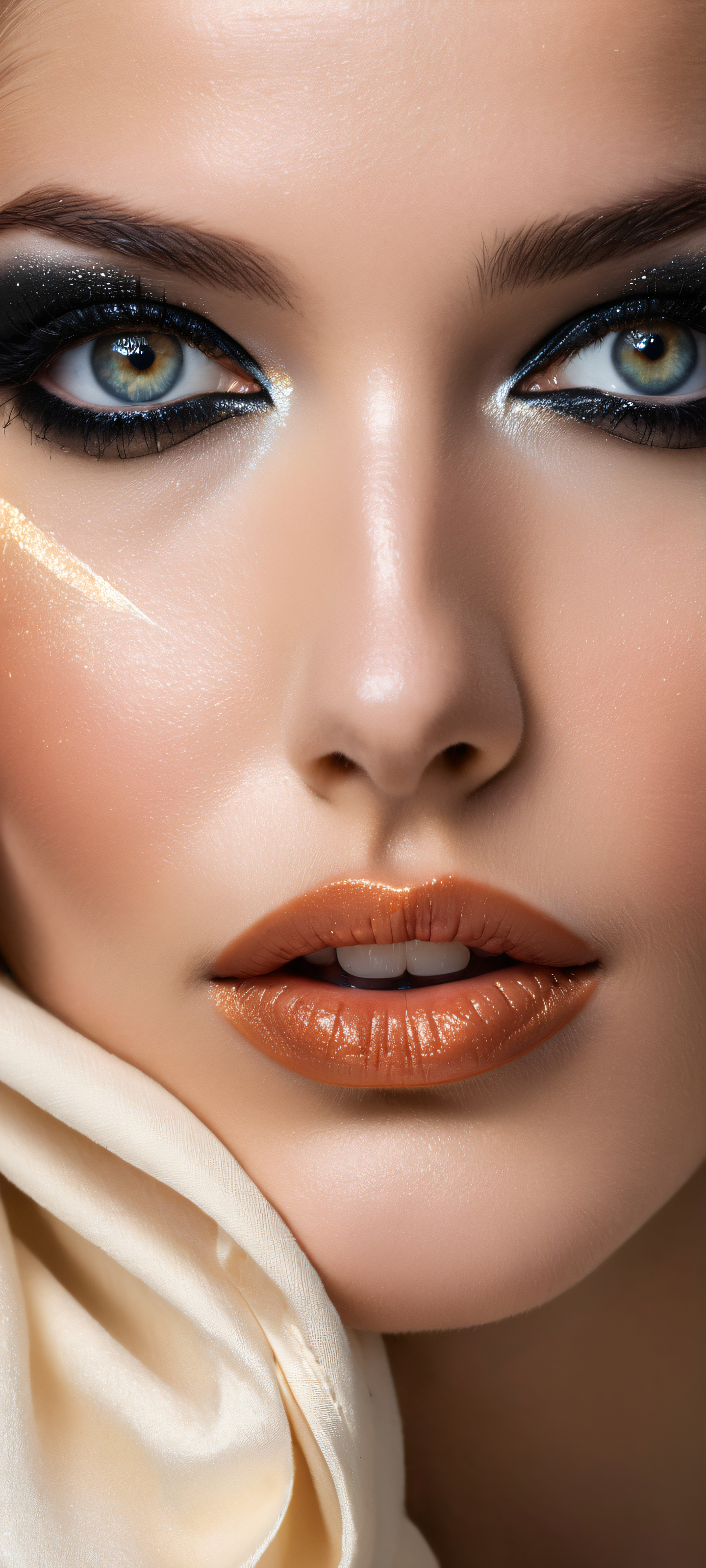 A breathtaking vertical portrait artwork of A stunning model placed in the lower-middle with intricate micro-details of her beautiful eyes and subtle facial expressions., Perfectly clean and empty top half with vast pure void, allowing the focus to be solely on the captivating subject. The bottom half features subtle texture and shading to create depth and dimension., Award-winning digital art with pristine clarity, showcasing the subject’s curvy figure from a unique angle, emphasizing the narrow waist and wide hips., Sleek dark mode aesthetic with deep perfect blacks, striking crisp contrast, and elegant luminescent accents that emphasize the model’s curves and facial features., #333333 (Deep Dark Gray) with accent highlights of #F7D2C4 (Soft Cream), elegant low-key lighting, deep perfect blacks, striking contrast, sleek dark mode aesthetic, luminescent accents, deep rich colors, portrait composition, centered subject in the lower middle, perfectly clean and smooth top half for UI, extreme depth of field blurred background, highly textured surfaces, intricate micro-details, physically based rendering, award-winning digital art, epic breathtaking scale, stunning visual impact, perfect composition, macOS wallpaper aesthetic, masterpiece, 2K QHD resolution, 9:20 aspect ratio.