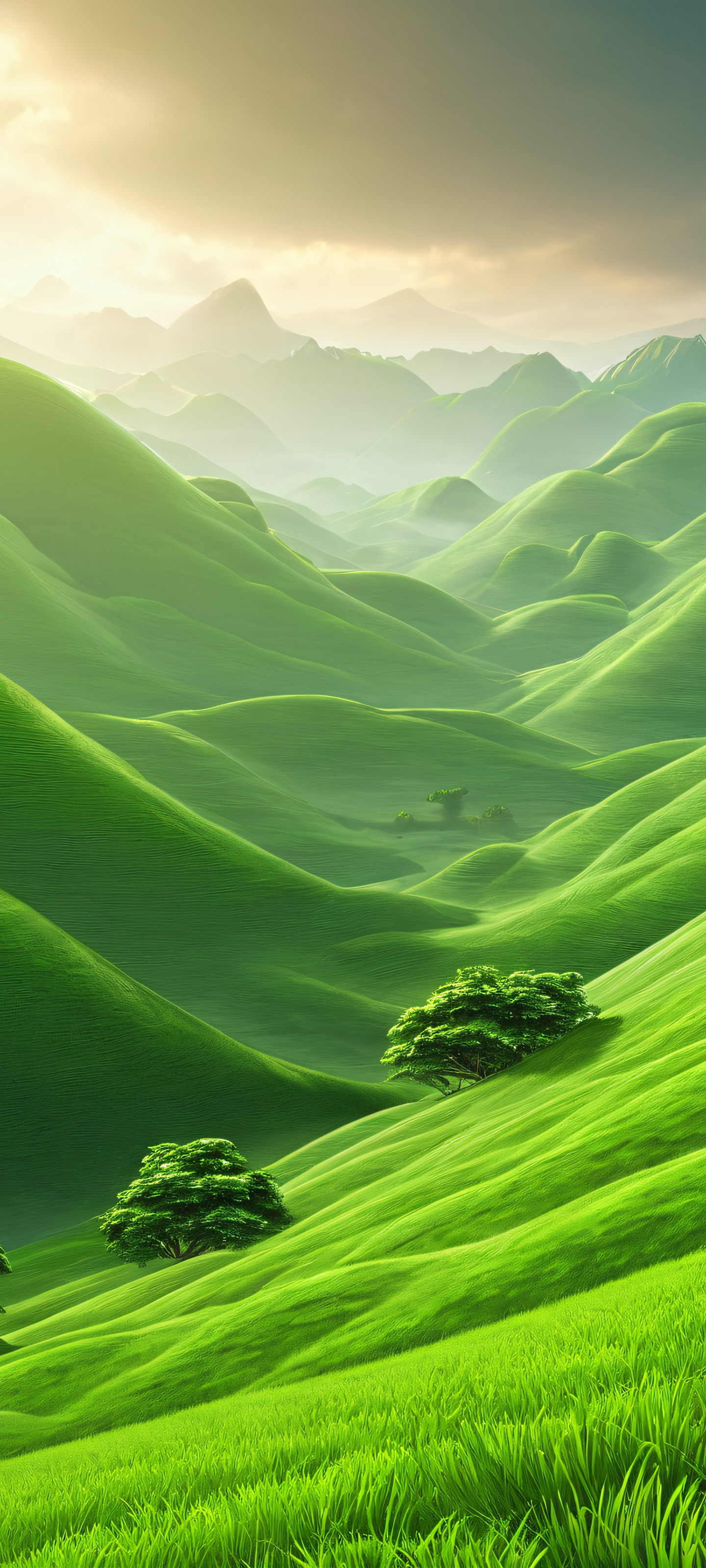 Escape to a serene and majestic landscape with this stunning vertical mobile wallpaper. Perfekt optimiert für das iPhone, Samsung Galaxy, und Android-Startbildschirme, this breathtaking scene features realistic terraformed hills, lush greenery, and a soothing overcast sky. Enjoy the highest quality and highest resolution (2K QHD) for an immersive experience.