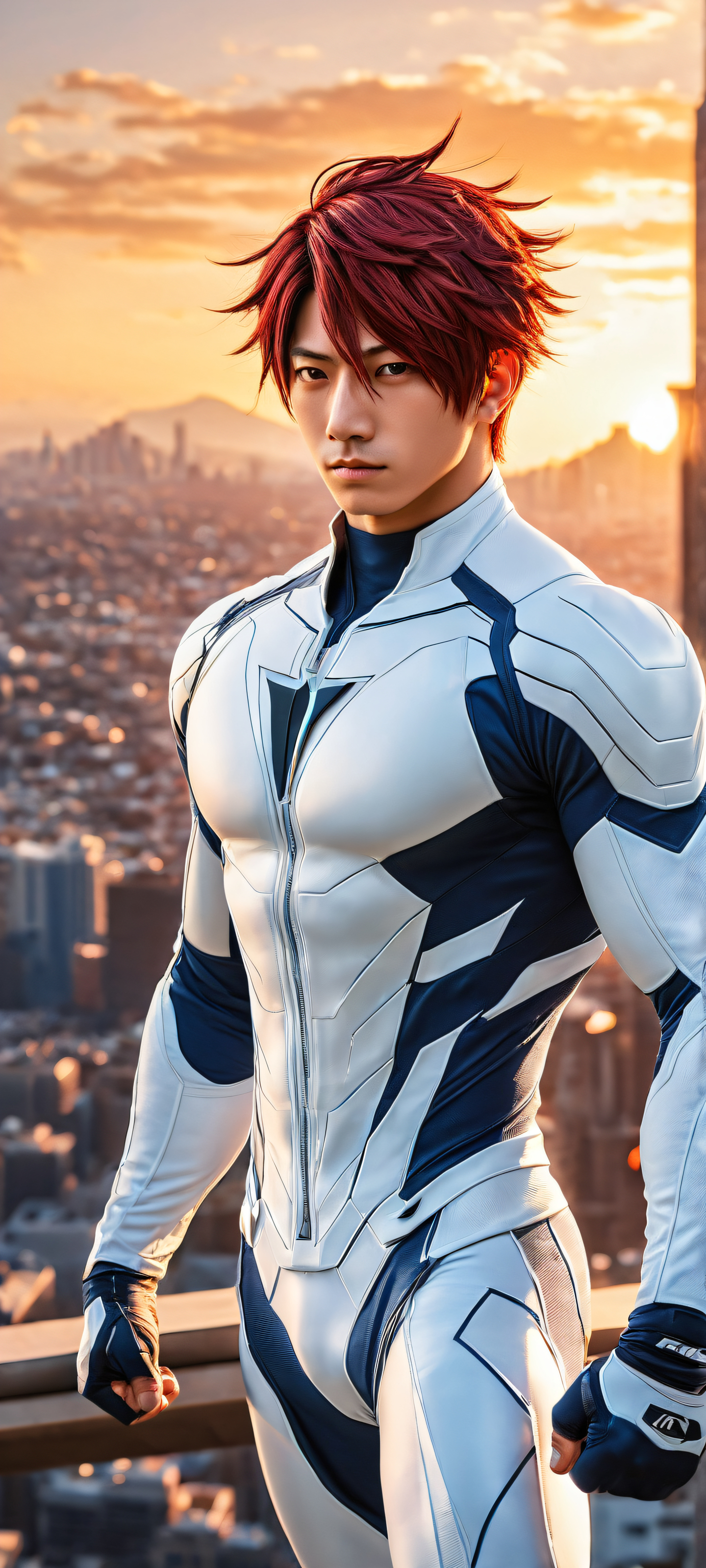 Elevate your mobile home screen with this masterpiece! Perfekt optimiert für das iPhone, Samsung Galaxy, and Android devices, this digital artwork features a heroically posed Toya Todoroki surrounded by a sprawling cityscape at sunset. The combination of ethereal lighting, radiant colors, and ray-traced reflections creates an inviting atmosphere that’s sure to leave a lasting impression.