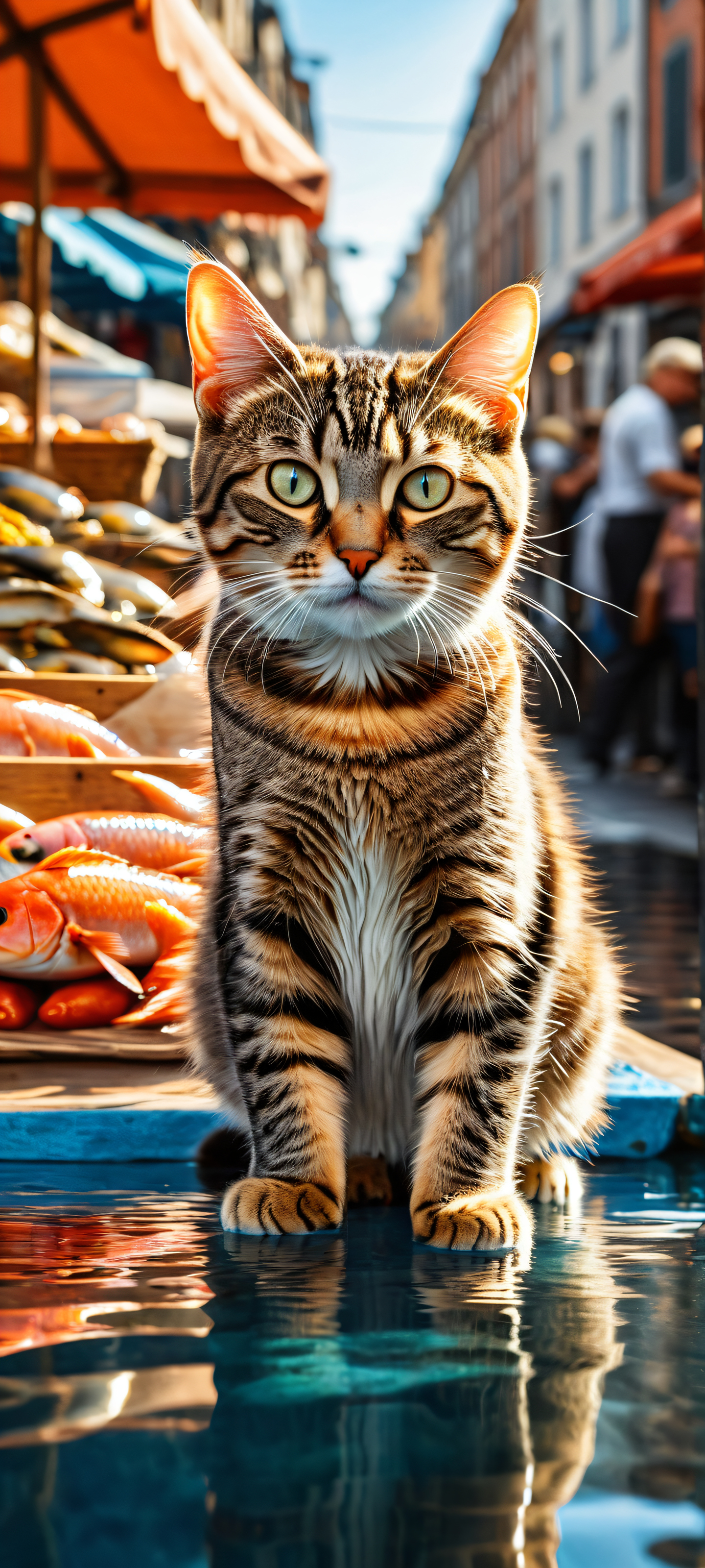 Immerse yourself in this breathtaking digital art masterpiece, perfekt optimiert für Ihr iPhone, Samsung Galaxy, und Android-Startbildschirme. The intricate details of the cat’s face and the shimmering scales of the fish will transport you to a whimsical world, while the vibrant atmosphere of the market adds an extra layer of visual magic.