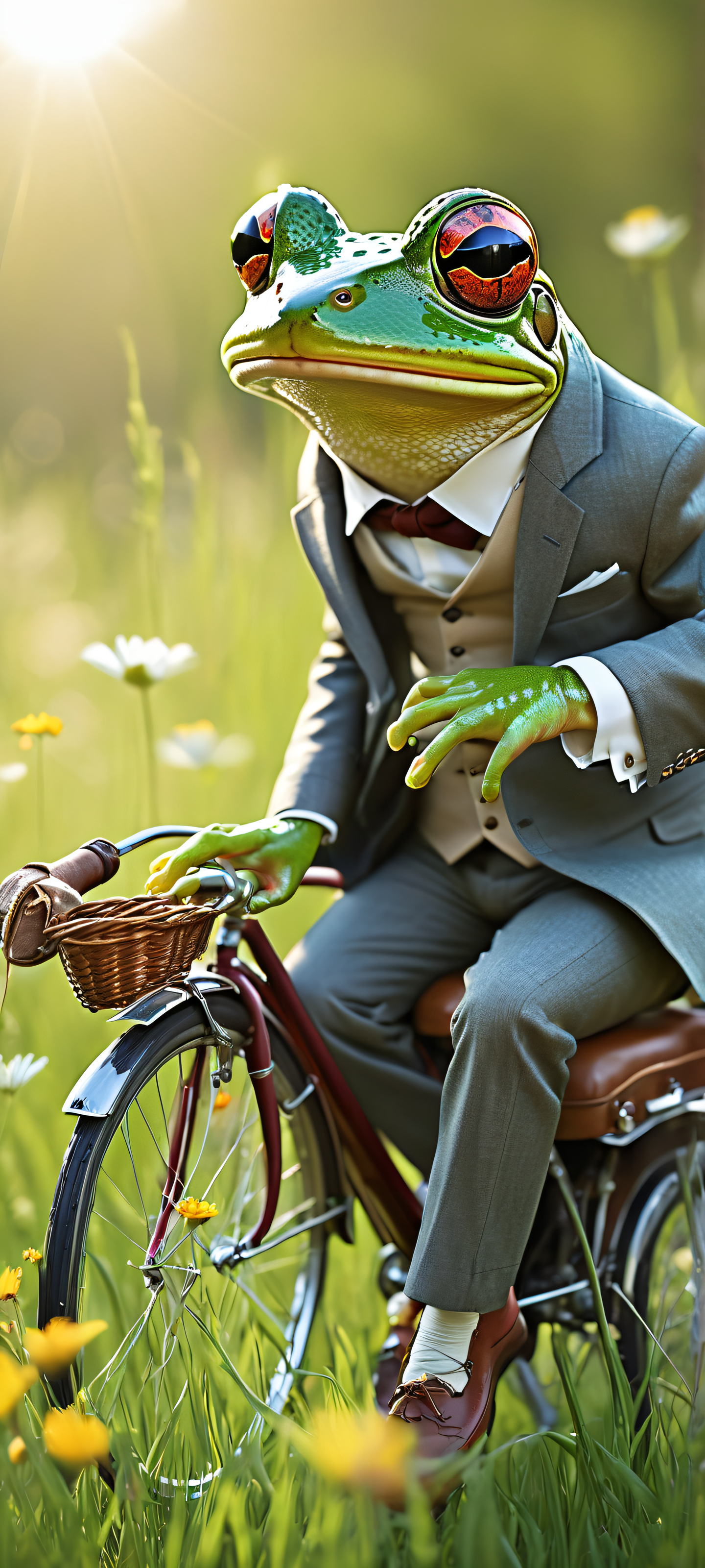 This stunning digital art is perfectly optimized for your iPhone or Samsung Galaxy home screen. Its breathtaking vertical portrait composition features a whimsical frog in a tailored suit riding a huge mouse with a leather saddle, set against a serene meadow backdrop. The result is a masterpiece that exudes visual impact and clarity.