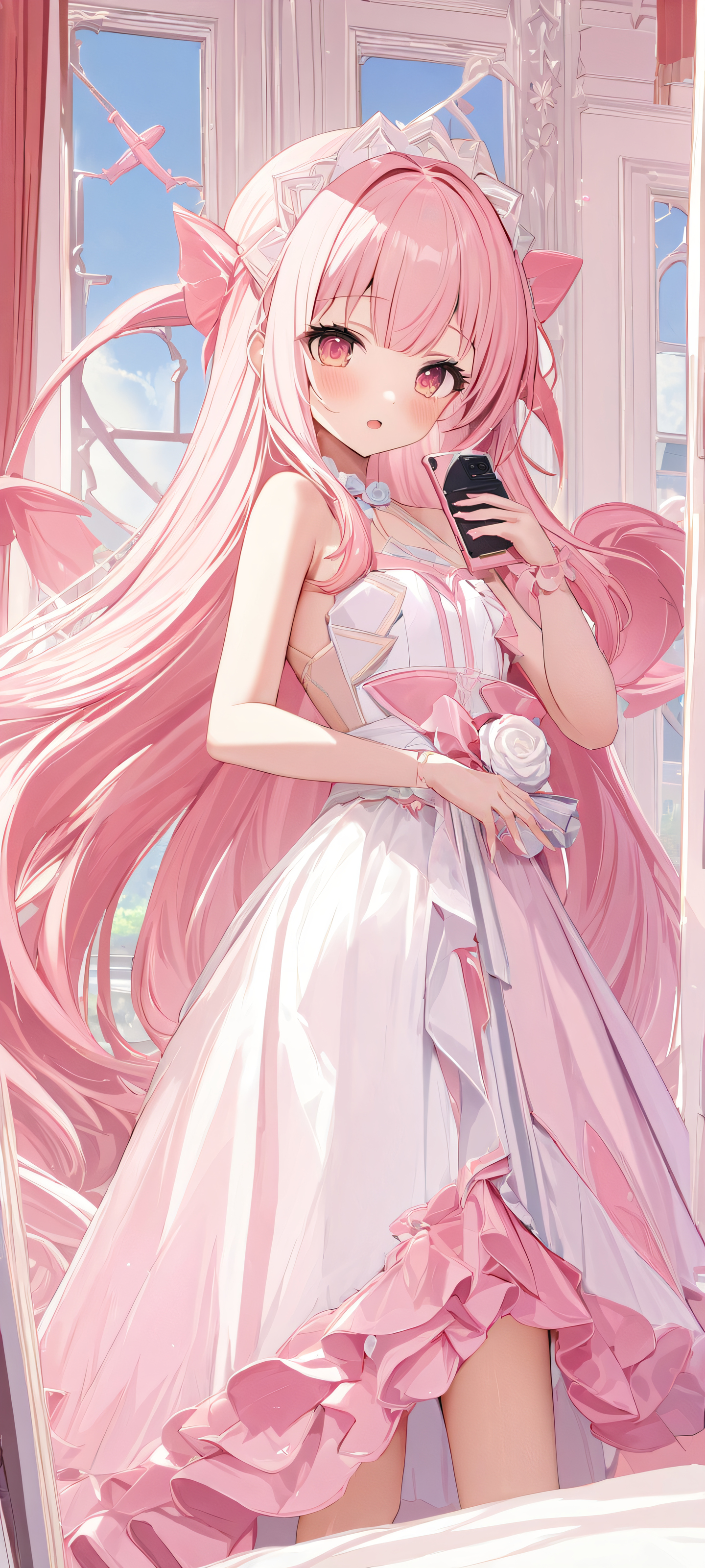 Elevate your mobile home screen with this stunning vertical wallpaper featuring a soft and cute anime girl in a cozy indoor setting. Perfekt optimiert für das iPhone, Samsung Galaxy, und Android-Startbildschirme, this masterpiece of pink and white hues is sure to delight and mesmerize.
