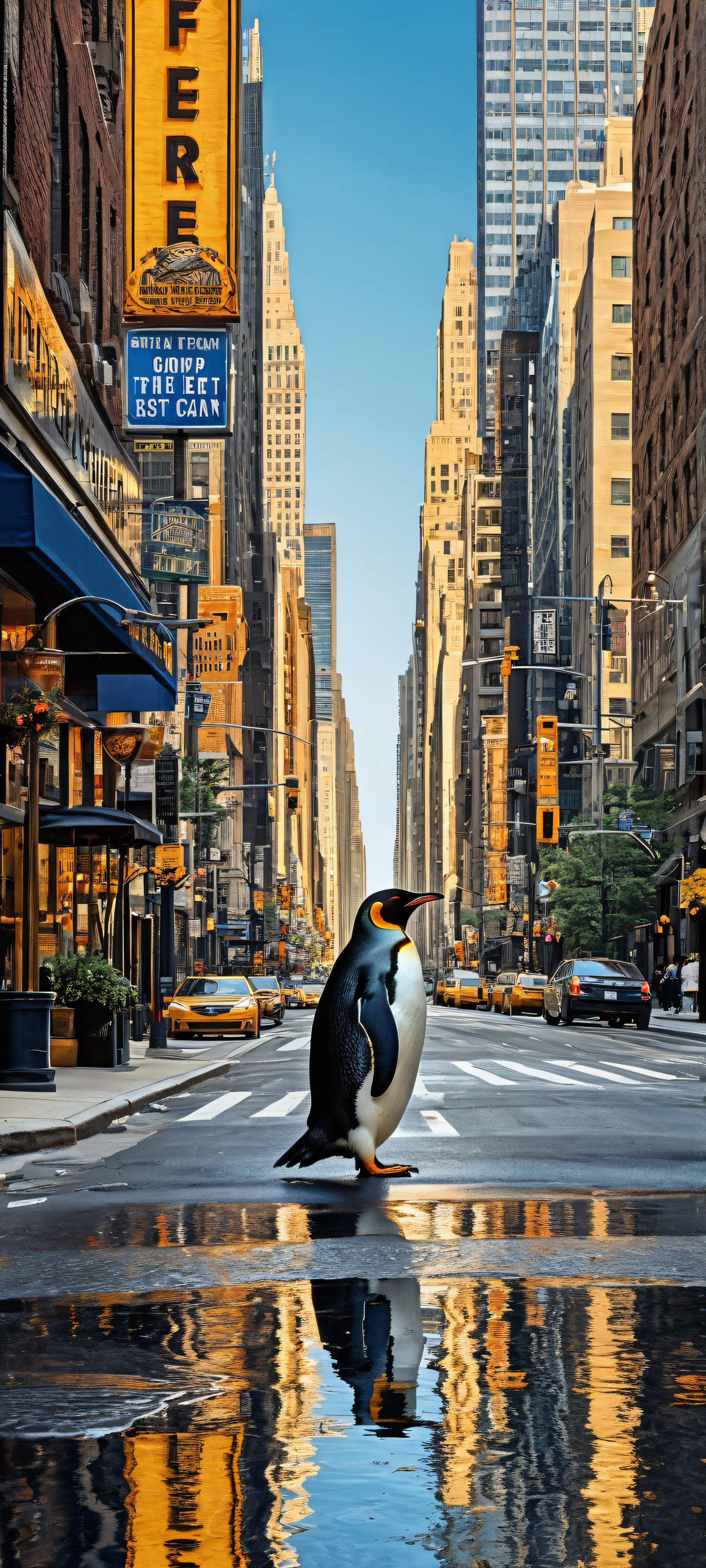 A breathtaking vertical portrait artwork of Comedic Icon placed in the lower-middle, intricate micro-details of a city sidewalk, with a great horned owl and a penguin in a humorous misadventure., Perfectly clean and empty top half with vast pure void, contrasted by the cluttered city sidewalk below, where our story unfolds., Award-winning digital art, pristine clarity with a touch of playfulness and irony, reflecting the absurdity of the scene., Sleek Dark Mode Aesthetic: Deep perfect blacks, striking crisp contrast, and elegant luminescent accents highlighting the textures of the trash can, the penguin’s feathers, and the blue gems on the crown., #2E4053 (a deep navy blue) with warm highlights of #F7D2C4 (a golden yellow-brown), evoking a sense of whimsical humor and light-heartedness., elegant low-key lighting, deep perfect blacks, striking contrast, sleek dark mode aesthetic, luminescent accents, deep rich colors, portrait composition, centered subject in the lower middle, perfectly clean and smooth top half for UI, extreme depth of field blurred background, highly textured surfaces, intricate micro-details, physically based rendering, award-winning digital art, epic breathtaking scale, stunning visual impact, perfect composition, macOS wallpaper aesthetic, masterpiece, 2K QHD resolution, 9:20 aspect ratio.