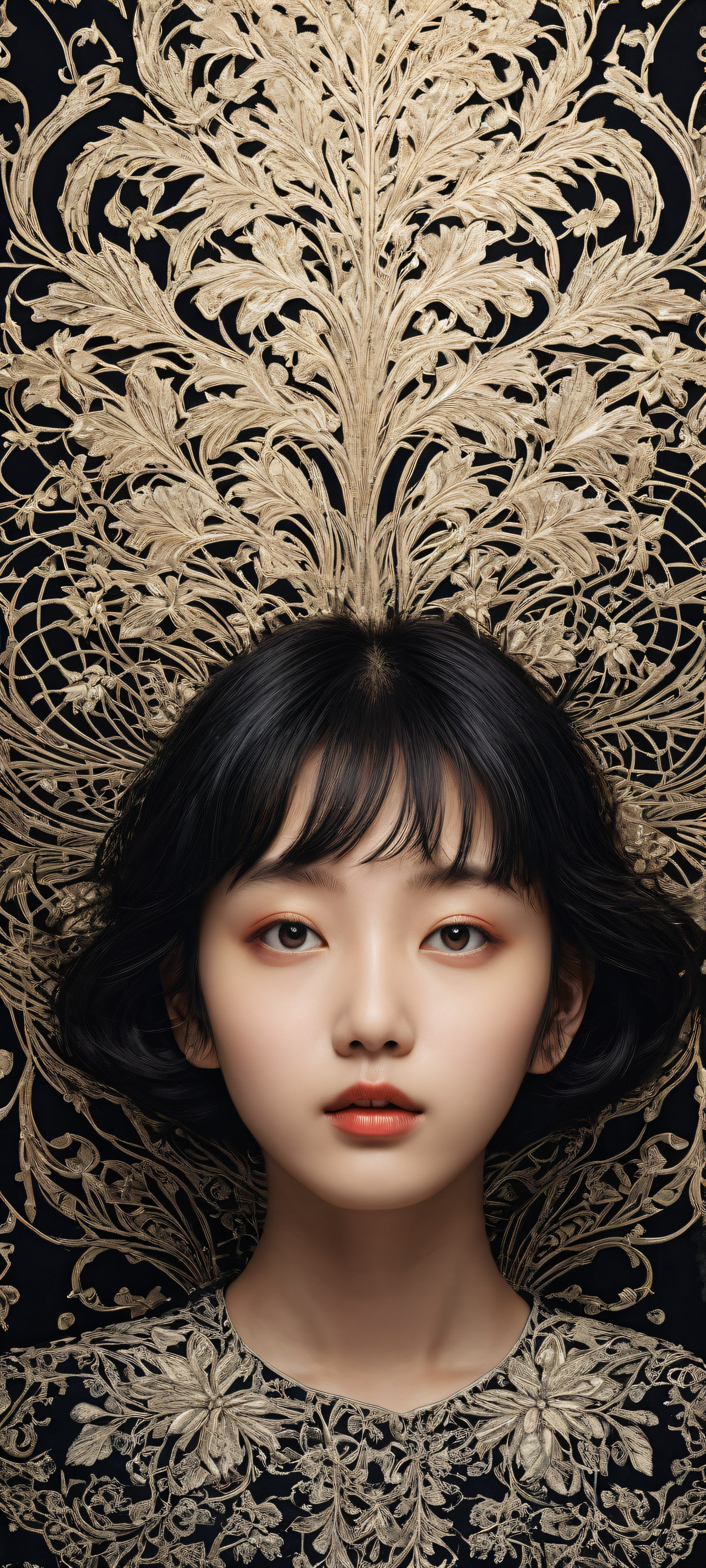 A breathtaking vertical portrait artwork of A young girl placed in the lower-middle, intricate micro-details of her whimsical world, Perfectly clean and empty top half with vast pure void, surrounded by delicate anime-inspired patterns, Award-winning digital art with crisp clarity and refined textures, a masterpiece of understated elegance, Deep perfect blacks and striking contrast, accented with elegant luminescent highlights to create an air of subtle sophistication, #8B9467 #C9E4CA #E5D8B6, elegant low-key lighting, deep perfect blacks, striking contrast, sleek dark mode aesthetic, luminescent accents, deep rich colors, portrait composition, centered subject in the lower middle, perfectly clean and smooth top half for UI, extreme depth of field blurred background, highly textured surfaces, intricate micro-details, physically based rendering, award-winning digital art, epic breathtaking scale, stunning visual impact, perfect composition, macOS wallpaper aesthetic, masterpiece, 2K QHD resolution, 9:20 aspect ratio.