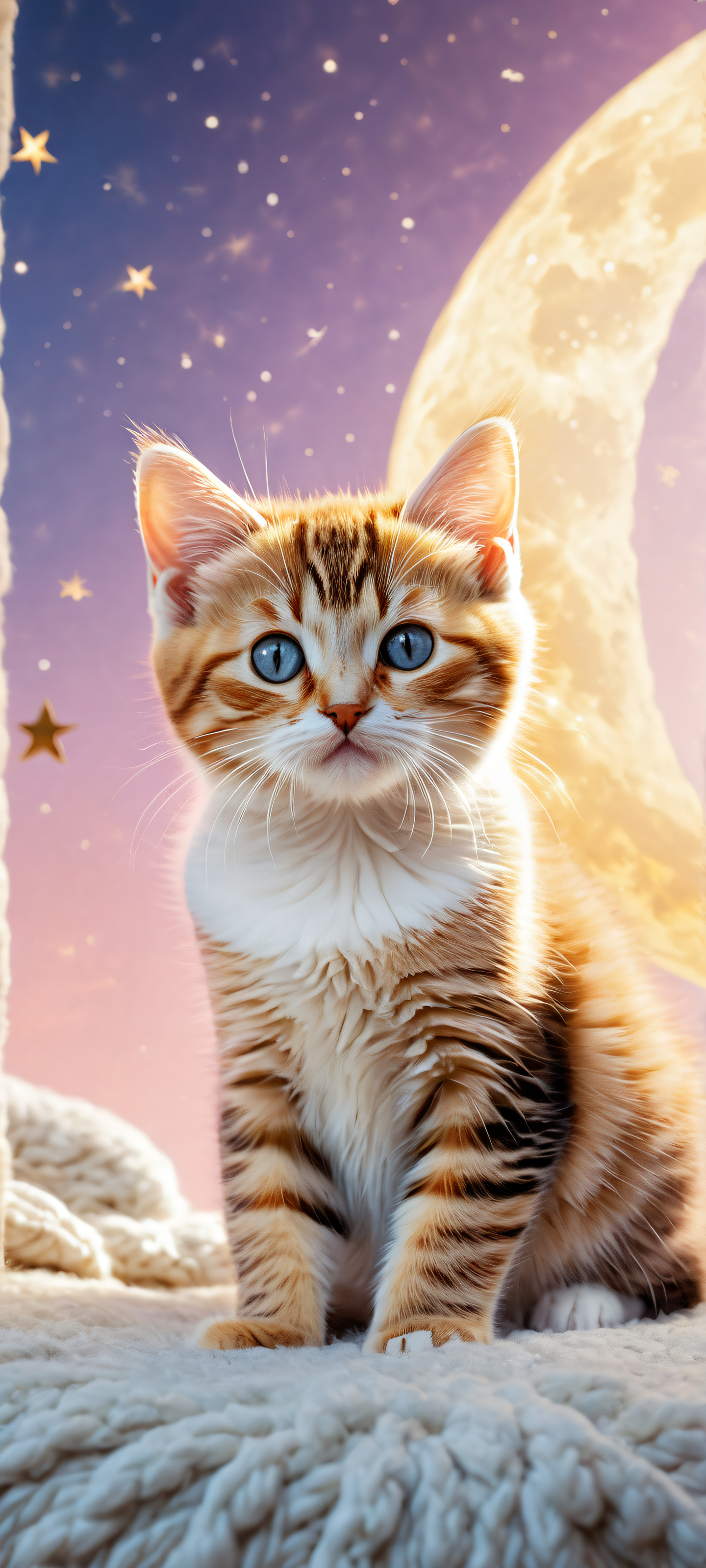 Immerse yourself in this breathtaking vertical portrait artwork, perfectly optimized for iPhone, Samsung Galaxy, and Android home screens. The soft fuzzy cat bed and pristine clarity of the background allow for seamless interaction with UI widgets, while the enchanting dreamscaped scene at the bottom transports you to a world of whimsy and wonder.