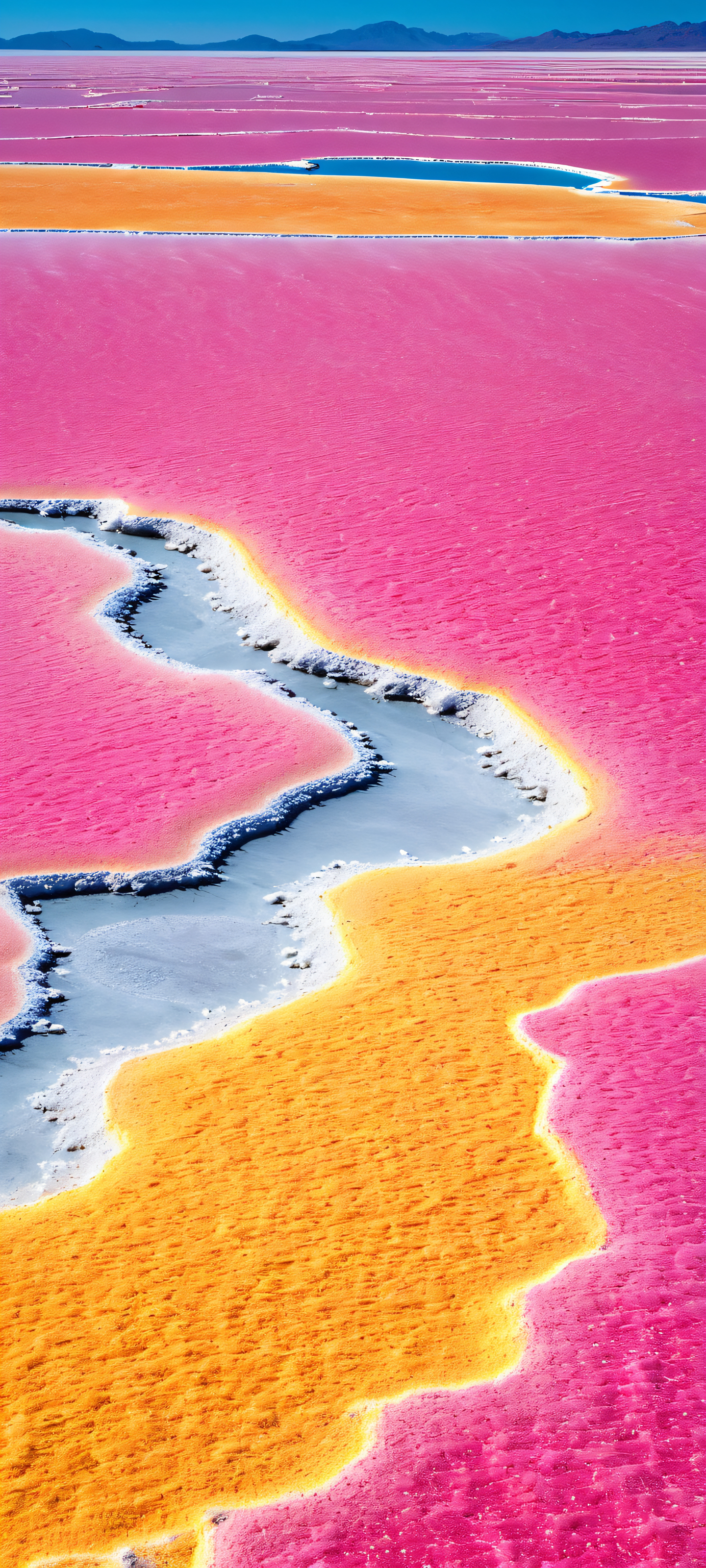 iPhone and Android users, behold the breathtaking vertical mobile phone wallpaper of Salt Flats, set against a dark background with dim lighting. Vibrant hues of bright pink, deep blues, and vibrant yellows dance across the masterpiece.