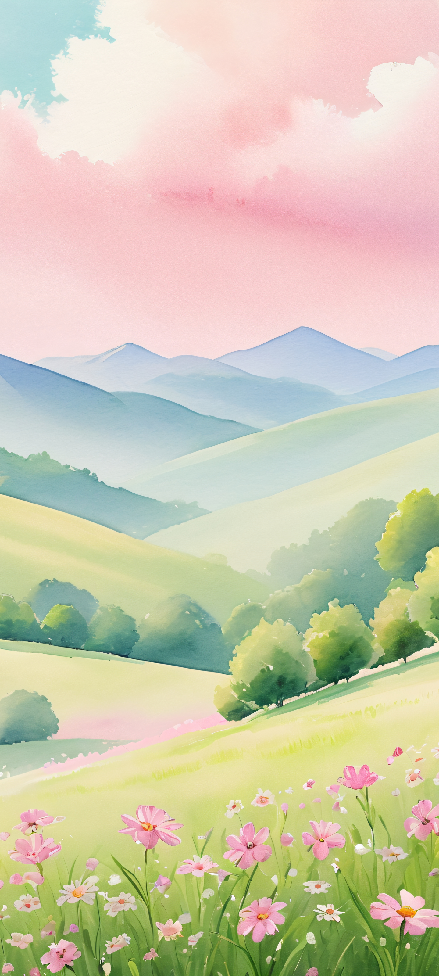 Breathtaking sunny meadow landscape with hills and soft overcast sky on a pastel pink and cream colored iPhone/Android wallpaper
