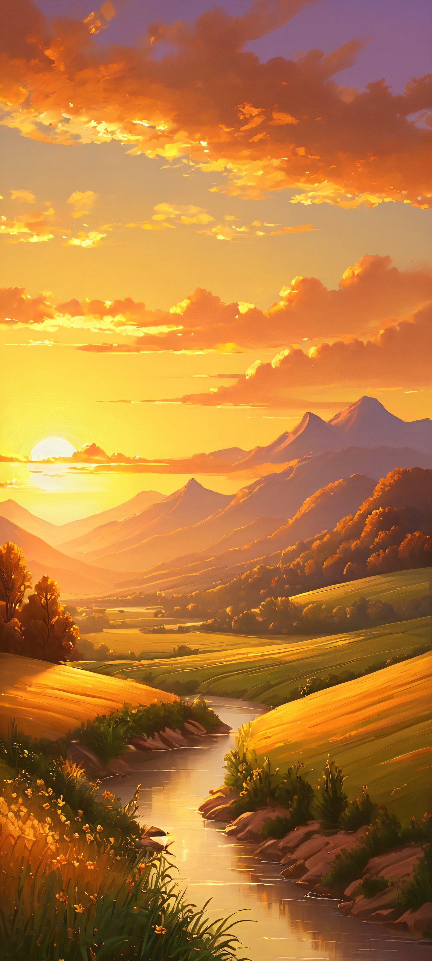 iPhone and Android users will love this breathtaking vertical mobile phone wallpaper of a valley at sunset, painted in exquisite detail with a warm golden glow.