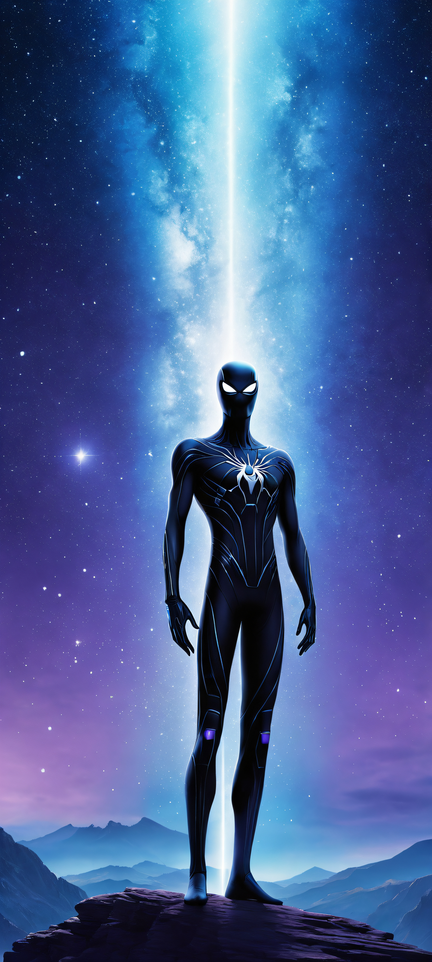 A breathtaking vertical portrait artwork of Enderman placed in the lower-middle with intricate micro-details, standing and looking out at the vast sky., Perfectly clean and empty top half with vast pure void, allowing for seamless integration of UI widgets. The bottom half features a majestic blue night sky filled with stars., Award-winning digital art, stunning visual impact, with a focus on ethereal lighting and pristine clarity., Ethereal lighting with a soft, radiant glow emanating from the star-filled sky, casting no harsh shadows and creating an air of serenity., Deep blues and purples dominate the palette, evoking a sense of mystery and wonder, while touches of silver and gold add a hint of celestial magic., ethereal lighting, radiant, brilliant colors, ray traced reflections, pristine clarity, portrait composition, centered subject in the lower middle, perfectly clean and smooth top half for UI, extreme depth of field blurred background, highly textured surfaces, intricate micro-details, physically based rendering, award-winning digital art, epic breathtaking scale, stunning visual impact, perfect composition, macOS wallpaper aesthetic, masterpiece, 2K QHD resolution, 9:20 aspect ratio.