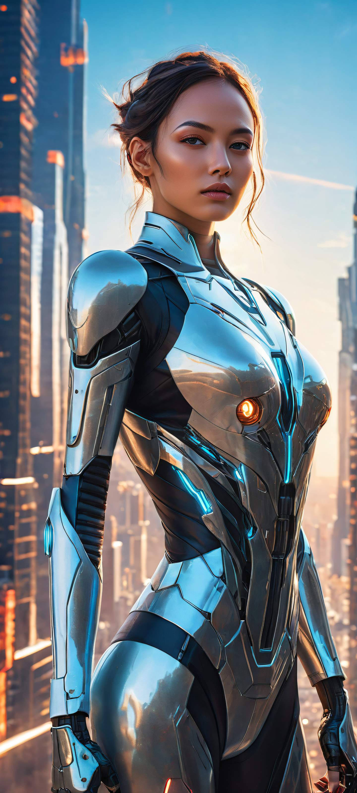 Immerse yourself in this breathtaking portrait of a futuristic robot girl, perfectly designed to be your new favorite wallpaper for your iPhone, samsung galaxia, or Android device. The stunning visual impact and pristine clarity make it an award-winning digital art piece that will transport you to a world of cyberpunk wonder. Centered in the lower-middle, the subject is framed against a vast pure void, slowly giving way to a cityscape with towering skyscrapers and neon lights.