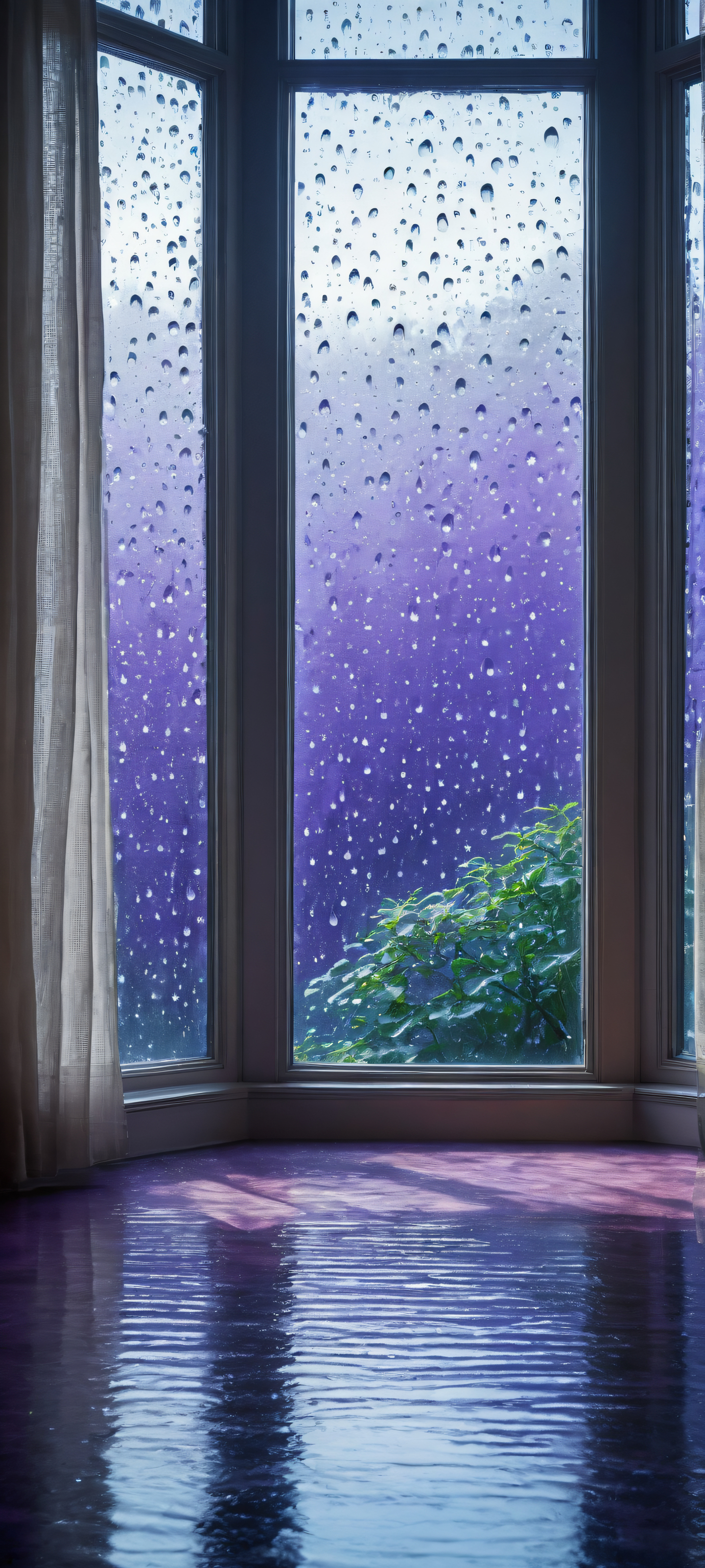A breathtaking vertical portrait artwork of Ditto, placed in the lower-middle with insane micro-details, waiting for its trainer who has not returned, despite the pouring rain and darkness., A perfectly clean and empty top half with a vast pure void, contrasting with the dimly lit and melancholic atmosphere of the room below., Award-winning watercolor digital art, pristine clarity, and delicate brushstrokes., Ethereal and radiant, with ray-traced reflections of raindrops on the windowpane, casting a warm glow on the otherwise dark scene., [“Deep blues and purples, evoking feelings of sorrow and longing, with accents of soft greens and whites to represent the hope of Ditto’s unwavering loyalty.”], iluminación etérea, radiant, brilliant colors, ray traced reflections, pristine clarity, portrait composition, centered subject in the lower middle, perfectly clean and smooth top half for UI, extreme depth of field blurred background, highly textured surfaces, intricate micro-details, physically based rendering, award-winning digital art, epic breathtaking scale, stunning visual impact, perfect composition, macOS wallpaper aesthetic, masterpiece, 2K QHD resolution, 9:20 aspect ratio.