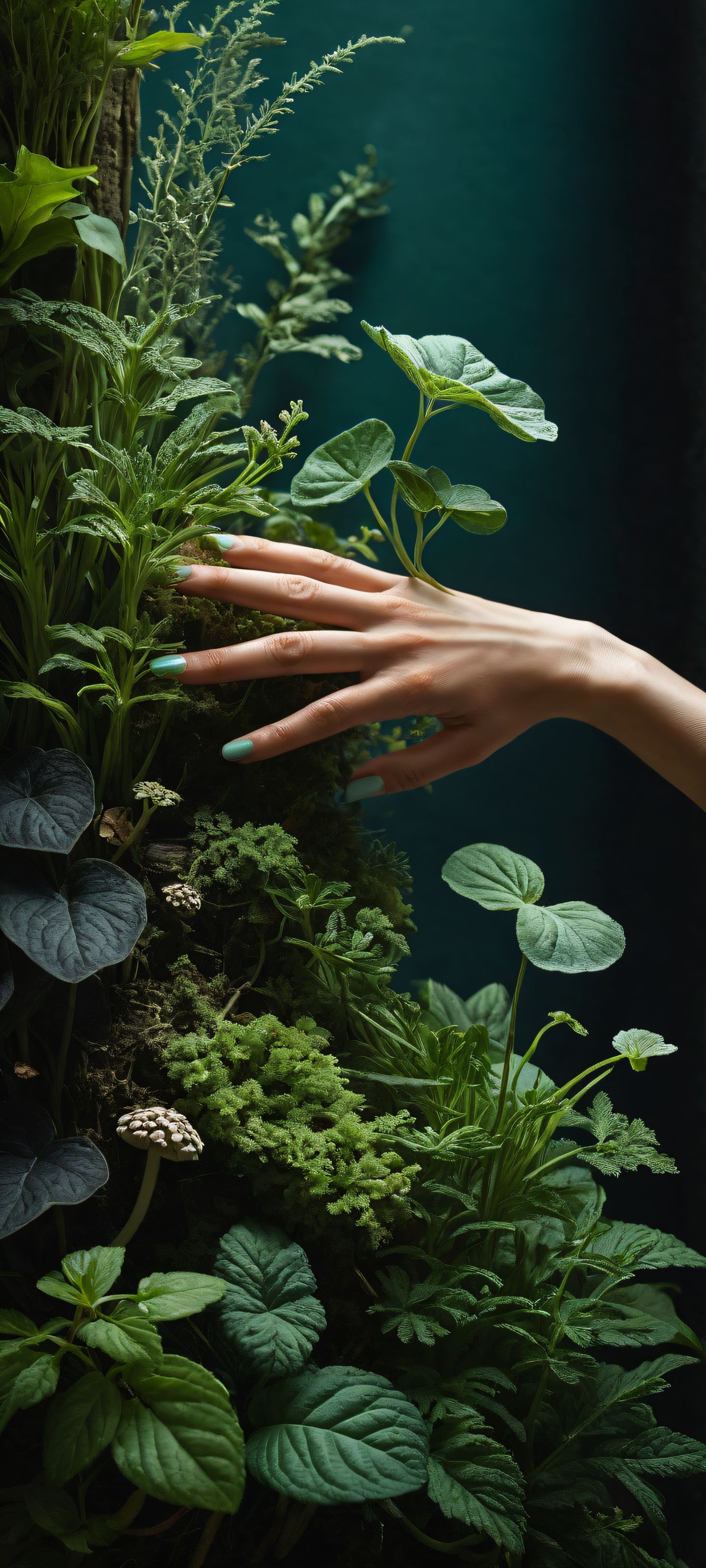 A breathtaking vertical portrait artwork of A witch’s hand delicately placing a rare fungus in the lower-middle, intricate micro-details of a lush plant arrangement., Perfectly clean and empty top half with vast pure void, contrasted by the vibrant foliage of various plants and herbs., Award-winning digital art, stunning visual impact with pristine clarity, showcasing exceptional texture and scale., Sleek dark mode aesthetic with deep perfect blacks, striking crisp contrast, and elegant luminescent accents, Soft pastel hues of mint, sage, and powder blue, subtly evoking a mystical atmosphere., elegant low-key lighting, deep perfect blacks, striking contrast, sleek dark mode aesthetic, luminescent accents, deep rich colors, portrait composition, centered subject in the lower middle, perfectly clean and smooth top half for UI, extreme depth of field blurred background, highly textured surfaces, intricate micro-details, physically based rendering, award-winning digital art, epic breathtaking scale, stunning visual impact, perfect composition, macOS wallpaper aesthetic, masterpiece, 2K QHD resolution, 9:20 aspect ratio.