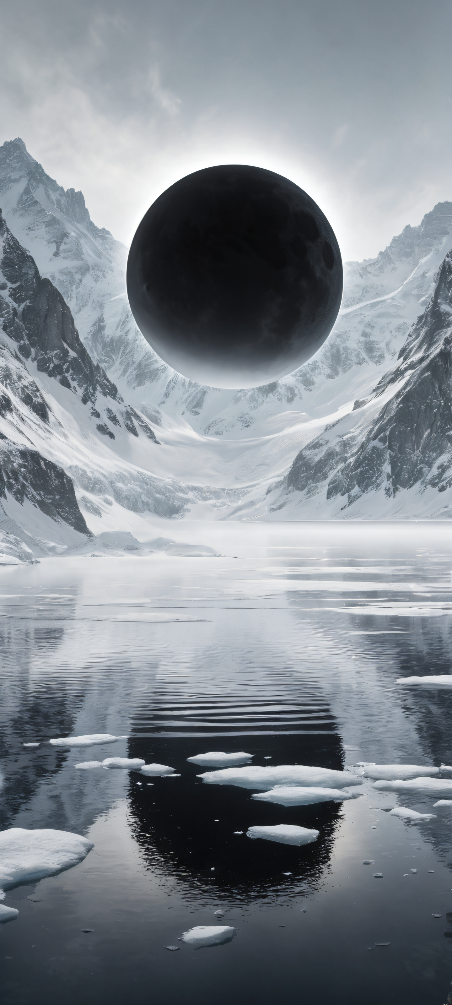 A breathtaking vertical portrait artwork of A massive black eclipse placed in the lower-middle with insane micro-details., Perfectly clean and empty top half with vast pure void, a dark tattered shroud walking across a perfectly smooth, reflective frozen lake of black obsidian below., Award-winning digital art, stunning visual impact, pristine clarity., Ethereal lighting with radiant, brilliant pale-white corona radiating from the massive black eclipse, ray-traced reflections on the frozen lake surface., Dominant color palette: Dark grayscale with touches of pale white and dark ash undertones, evoking a melancholic void atmosphere., iluminación etérea, radiant, brilliant colors, ray traced reflections, pristine clarity, portrait composition, centered subject in the lower middle, perfectly clean and smooth top half for UI, extreme depth of field blurred background, highly textured surfaces, intricate micro-details, physically based rendering, award-winning digital art, epic breathtaking scale, stunning visual impact, perfect composition, macOS wallpaper aesthetic, masterpiece, 2K QHD resolution, 9:20 aspect ratio.