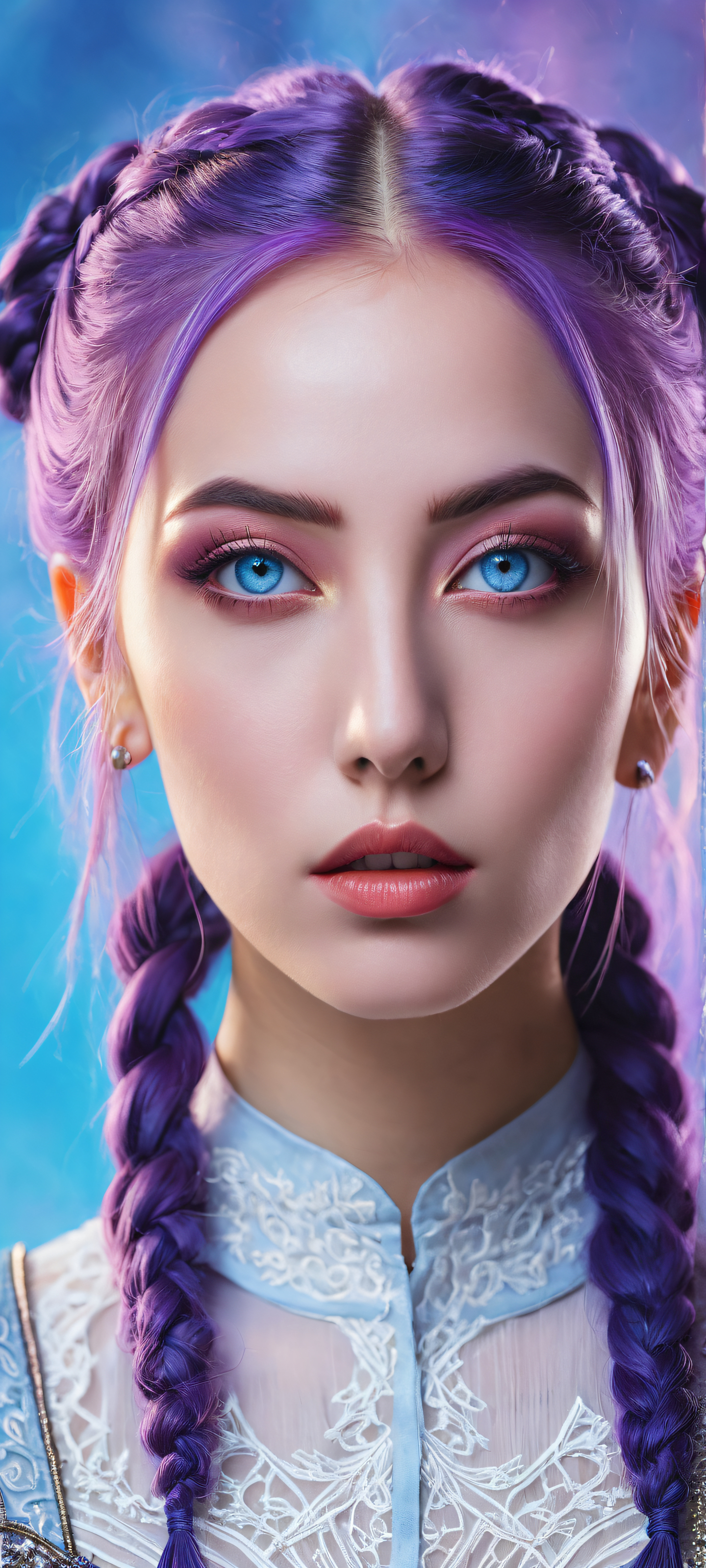 Behold the enchanting portrait of a mystical maiden, perfectly optimized for your iPhone, samsung galaxia, or Android home screen. Her piercing blue eyes invite you to gaze into the void, as her intricate hairstyle and award-winning digital art mastery come alive in stunning 8K resolution.