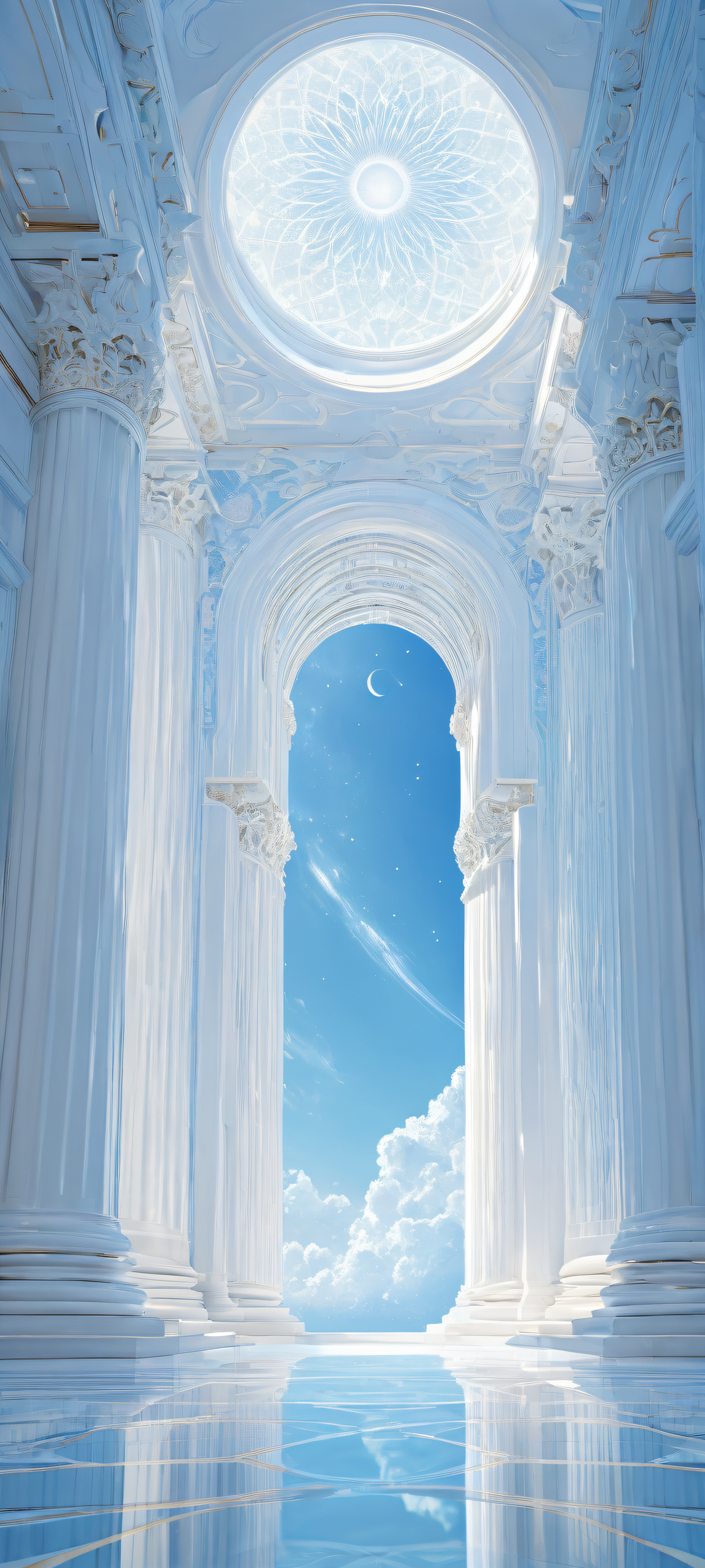 A breathtaking vertical portrait artwork of placed in the lower-middle, intricate micro-details of celestial architecture, perfectly clean and empty top half with vast pure void, allowing for UI widgets to breathe comfortably, award-winning digital art, pristine clarity, stunning visual impact with Flat vector and flat color palette, ethereal lighting with radiant, brilliant colors, ray traced reflections, and flawless digital masterpiece, palette of soft blues (#87CEEB) and whites (#FFFFFF), evoking a sense of serenity and hope, iluminación etérea, radiant, brilliant colors, ray traced reflections, pristine clarity, portrait composition, centered subject in the lower middle, perfectly clean and smooth top half for UI, extreme depth of field blurred background, highly textured surfaces, intricate micro-details, physically based rendering, award-winning digital art, epic breathtaking scale, stunning visual impact, perfect composition, macOS wallpaper aesthetic, masterpiece, 2K QHD resolution, 9:20 aspect ratio.