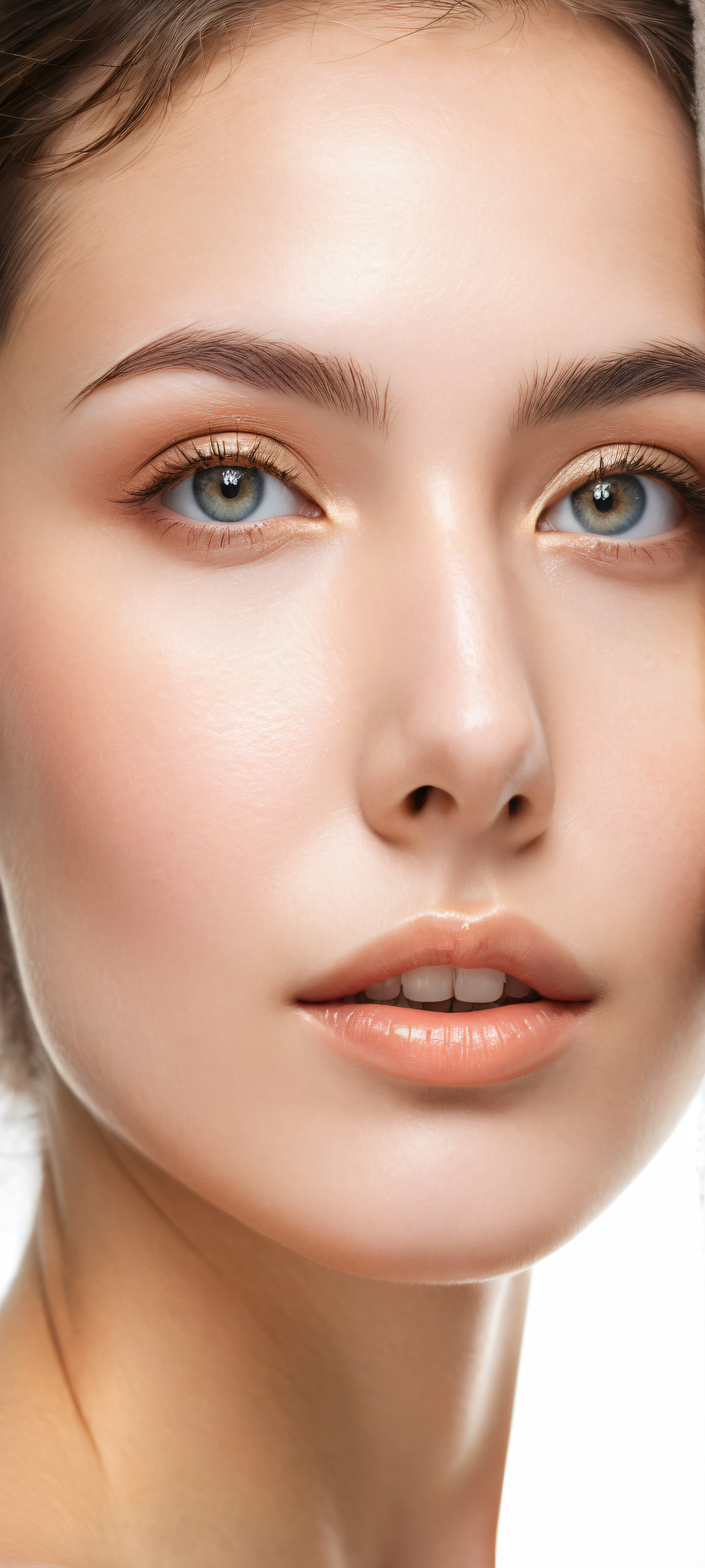 A breathtaking vertical portrait artwork of A serene young woman placed in the lower-middle with insane micro-details on her intricate facial features and radiant skin, inviting the viewer to gaze into her eyes., Perfectly clean and empty top half with vast pure void, allowing UI widgets to breathe smoothly, while the lower half is filled with a serene atmosphere., Award-winning digital art, stunning visual impact, featuring flawless, realistic renders and pristine clarity., Etéreo, soft, and radiant light pours from above, casting no harsh shadows, creating an air of tranquility and inviting the viewer in., #FFC0CB, #F5DEB3, #E4D6F5, #C9E4CA, iluminación etérea, radiant, brilliant colors, ray traced reflections, pristine clarity, portrait composition, centered subject in the lower middle, perfectly clean and smooth top half for UI, extreme depth of field blurred background, highly textured surfaces, intricate micro-details, physically based rendering, award-winning digital art, epic breathtaking scale, stunning visual impact, perfect composition, macOS wallpaper aesthetic, masterpiece, 2K QHD resolution, 9:20 aspect ratio.