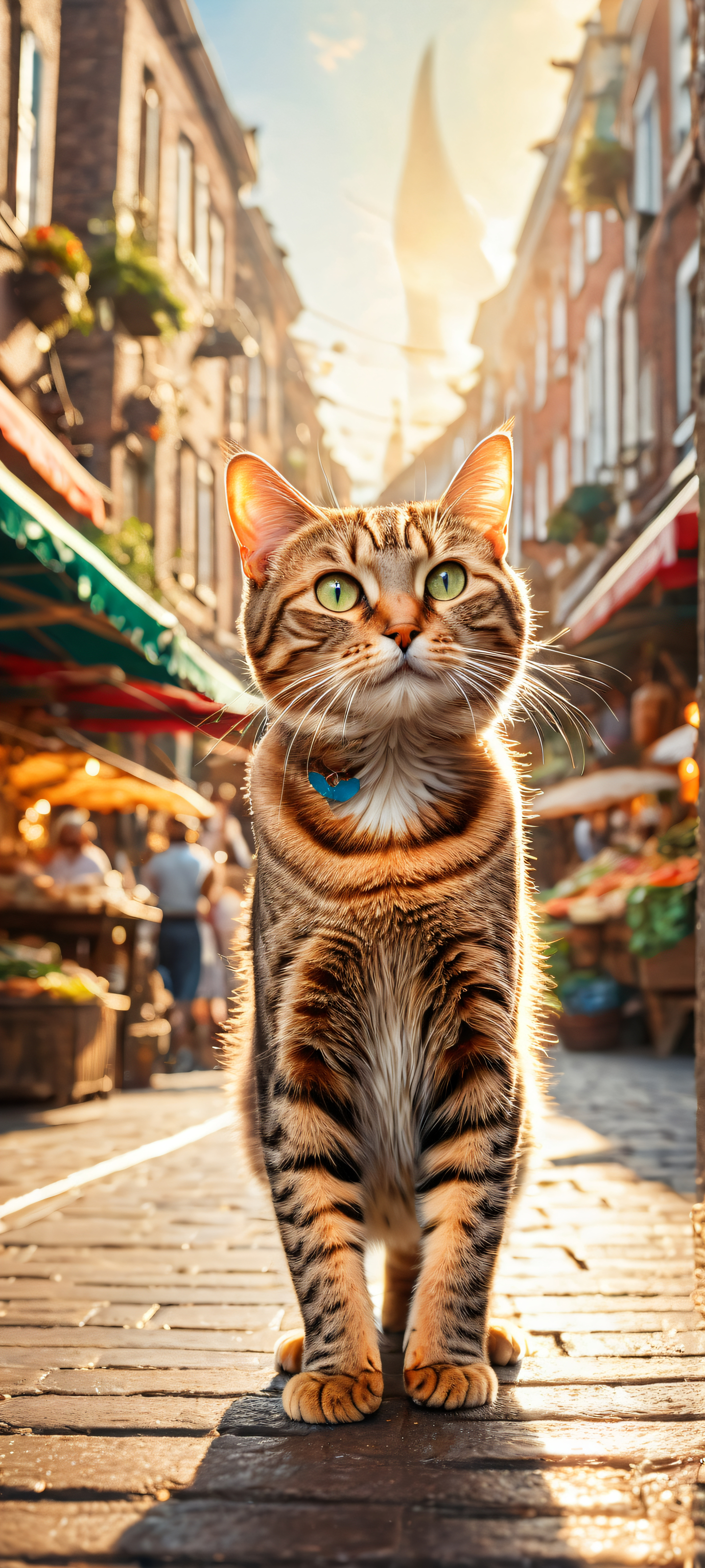 A breathtaking vertical portrait artwork of A small young tabby cat, placed in the lower-middle with insane micro-details, running on two legs while tightly hugging a large, shiny silver fish., Perfectly clean and empty top half with vast pure void, below which is a bustling Dutch street market scene with fresh fishes laid out on a stall to the right., Award-winning digital art, stunning visual impact, and pristine clarity. A masterpiece that blends humor and drama., Ethereal lighting with radiant, brilliant colors, ray traced reflections, and pristine clarity. Bright and airy, as if lit by a warm sunny day., Dominant color palette featuring earthy tones such as beige, brown, and green, with pops of shimmering silver from the fish., iluminación etérea, radiant, brilliant colors, ray traced reflections, pristine clarity, portrait composition, centered subject in the lower middle, perfectly clean and smooth top half for UI, extreme depth of field blurred background, highly textured surfaces, intricate micro-details, physically based rendering, award-winning digital art, epic breathtaking scale, stunning visual impact, perfect composition, macOS wallpaper aesthetic, masterpiece, 2K QHD resolution, 9:20 aspect ratio.