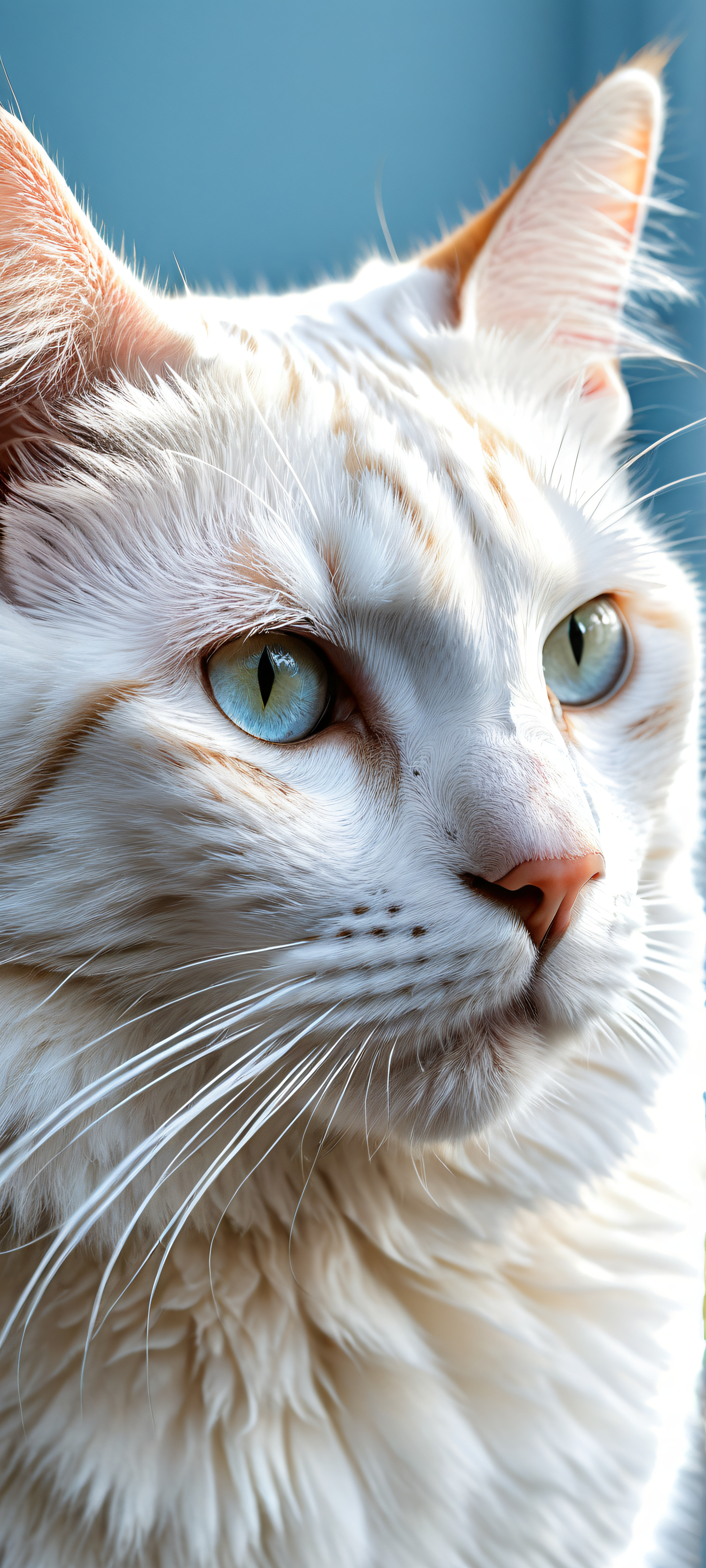 A breathtaking vertical portrait artwork of Feral Cat placed in the lower-middle with insane micro-details on its whiskers and fur texture, extreme depth of field, Perfectly clean and empty top half with vast pure void, allowing UI widgets to breathe freely, while the bottom half is home to a serene white background, Award-winning digital art with pristine clarity, reflecting perfection, Ethereal lighting with radiant, brilliant colors, subtle ray traced reflections, and crisp clarity, creating an immersive atmosphere, Pastel hues of pale blue and cream, evoking a sense of ethereal calmness, allowing the feral cat’s fur to shine with soft luminescence, iluminación etérea, radiant, brilliant colors, ray traced reflections, pristine clarity, portrait composition, centered subject in the lower middle, perfectly clean and smooth top half for UI, extreme depth of field blurred background, highly textured surfaces, intricate micro-details, physically based rendering, award-winning digital art, epic breathtaking scale, stunning visual impact, perfect composition, macOS wallpaper aesthetic, masterpiece, 2K QHD resolution, 9:20 aspect ratio.