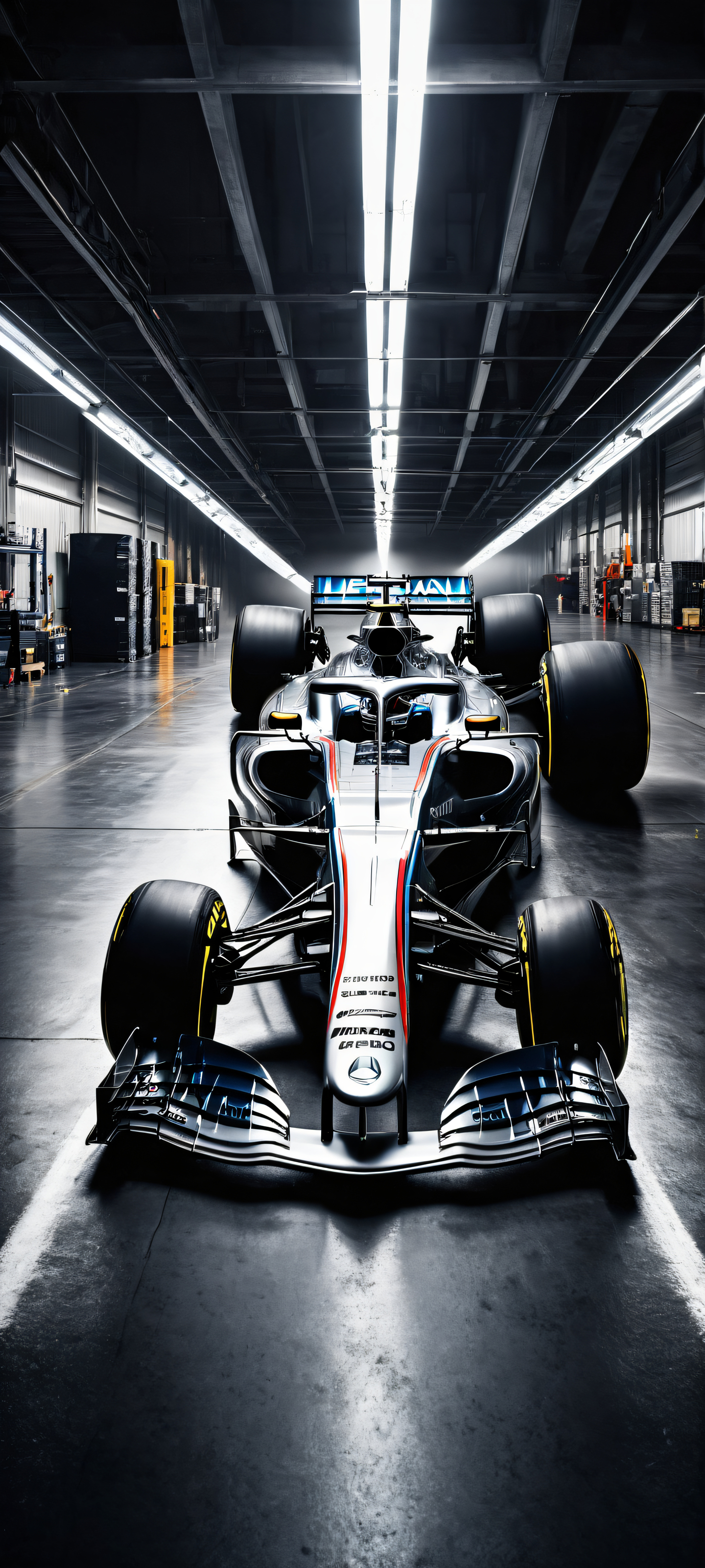 A breathtaking vertical portrait artwork of Formula 1 vehicle placed in the lower-middle with intricate micro-details of wheels and light bar, Perfectly clean and empty top half with vast pure void, contrasted by a dimly lit garage in the bottom half, Award-winning digital art, stunning visual impact, and pristine clarity, Deep blacks and crisp contrast with subtle luminescent accents from the light bar and vehicle’s details, #3B3F4E (Dark Metallic Grey) and #45494A (Deep Dark Blue) with accents of #FFFFFF (Pure White), elegant low-key lighting, deep perfect blacks, striking contrast, sleek dark mode aesthetic, luminescent accents, deep rich colors, portrait composition, centered subject in the lower middle, perfectly clean and smooth top half for UI, extreme depth of field blurred background, highly textured surfaces, intricate micro-details, physically based rendering, award-winning digital art, epic breathtaking scale, stunning visual impact, perfect composition, macOS wallpaper aesthetic, masterpiece, 2K QHD resolution, 9:20 aspect ratio.