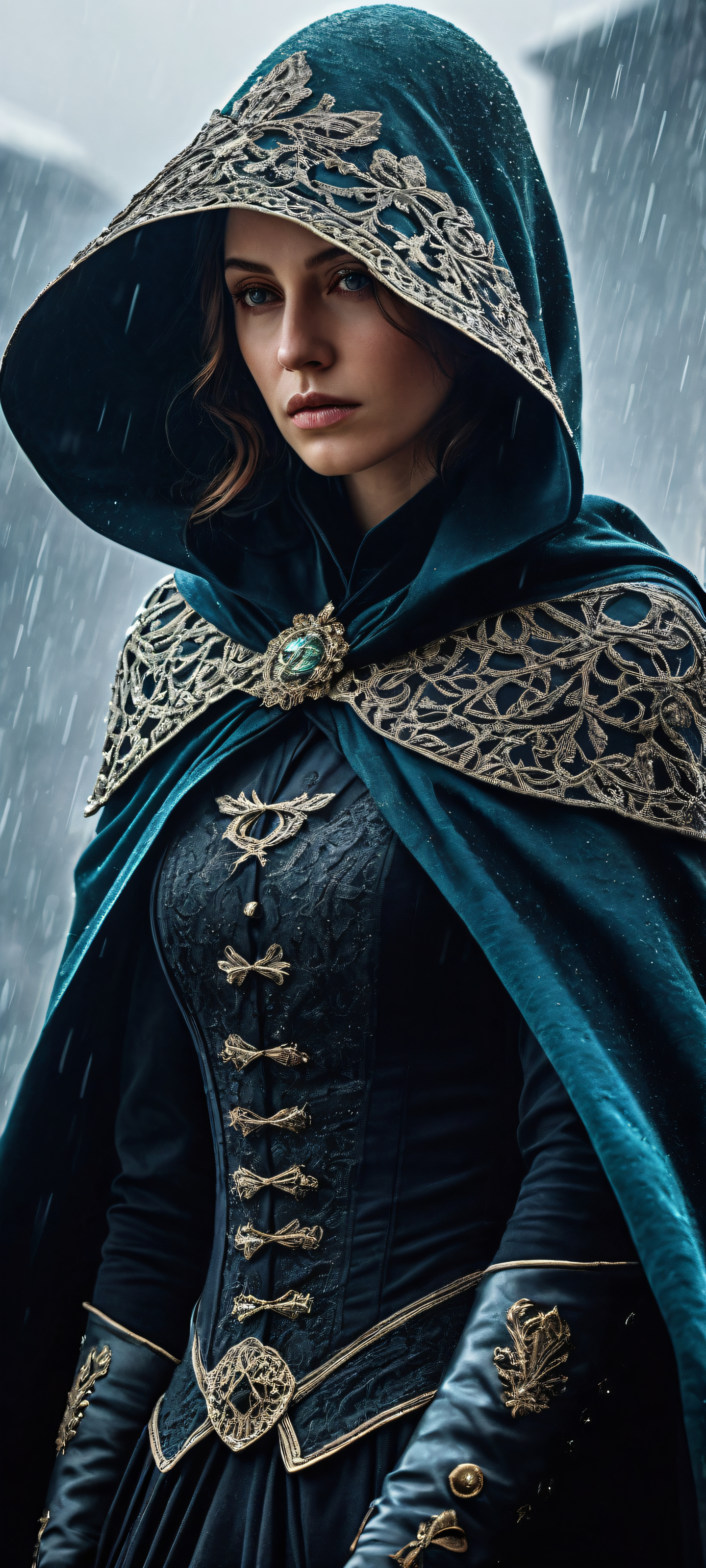 A breathtaking vertical portrait artwork of A 1800s masked hero with a sad face is placed in the lower-middle, intricate micro-details of her cape and the folds of her hat are accentuated., The background features a perfectly clean and empty top half with vast pure void, giving way to the atmospheric rain below., Award-winning digital art with stunning visual impact and pristine clarity., Ethereal lighting with brilliant colors and ray-traced reflections, capturing the essence of the rainy day., #455A64, #8B9467, iluminación etérea, radiant, brilliant colors, ray traced reflections, pristine clarity, portrait composition, centered subject in the lower middle, perfectly clean and smooth top half for UI, extreme depth of field blurred background, highly textured surfaces, intricate micro-details, physically based rendering, award-winning digital art, epic breathtaking scale, stunning visual impact, perfect composition, macOS wallpaper aesthetic, masterpiece, 2K QHD resolution, 9:20 aspect ratio.