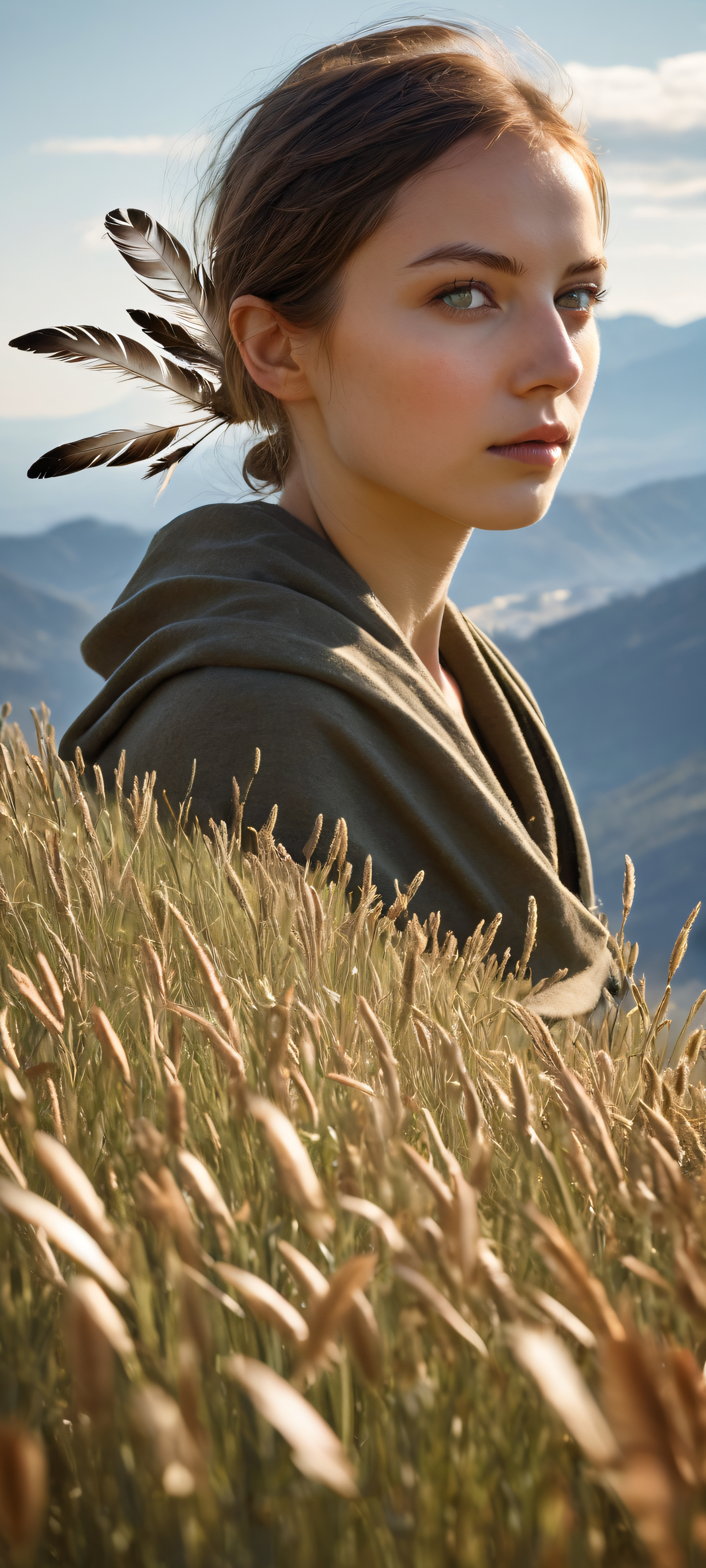 A breathtaking vertical portrait artwork of A lone girl placed in the lower-middle, intricate micro-details of a vast open range, with expertly crafted 3D grass blades and realistic horse feathers., Perfectly clean and empty top half with vast pure void, providing ample breathing space for UI widgets, while the bottom half showcases a serene landscape of rolling hills and distant mountains., Award-winning digital art, pristine clarity, and exceptional texture, rivaling the highest-end Apple UI standards., Deep perfect blacks, striking crisp contrast, and elegant luminescent accents create a sleek dark mode aesthetic, free from cinematic lighting and volumetric effects, instead embracing a clean and minimalist approach., #FFC080 (Warm Beige), #5B6A73 (Soft Sage), and #4E5338 (Rich Earth) form the dominant palette, evoking feelings of serenity, tranquility, and connection with nature., elegant low-key lighting, deep perfect blacks, striking contrast, sleek dark mode aesthetic, luminescent accents, deep rich colors, portrait composition, centered subject in the lower middle, perfectly clean and smooth top half for UI, extreme depth of field blurred background, highly textured surfaces, intricate micro-details, physically based rendering, award-winning digital art, epic breathtaking scale, stunning visual impact, perfect composition, macOS wallpaper aesthetic, masterpiece, 2K QHD resolution, 9:20 aspect ratio.