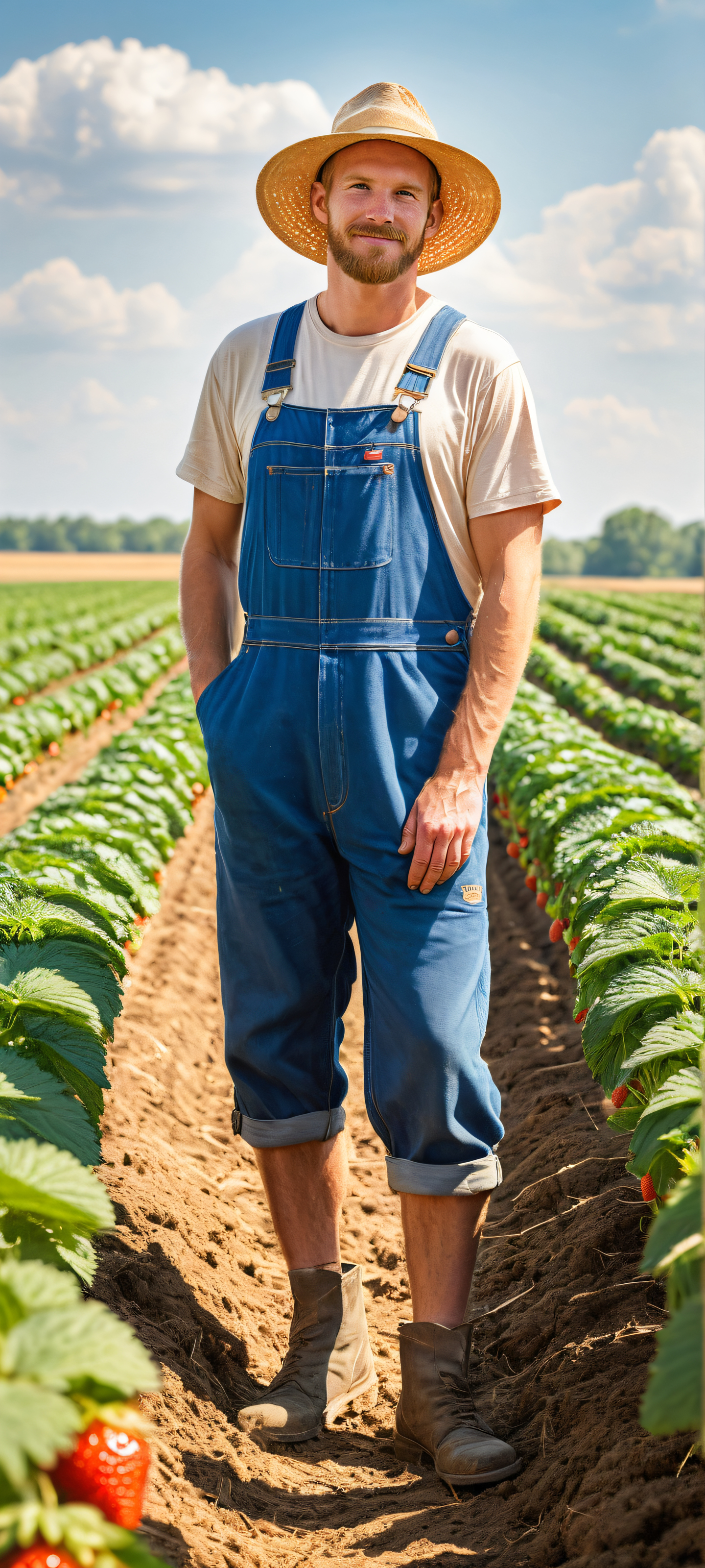 Sumérgete en este impresionante retrato vertical, perfectly optimized for your iPhone, samsung galaxia, or Android home screen. The farmer’s rustic charm, the strawberry farm’s micro-details, and the softbox lighting come together to create a stunning visual impact that will leave you wanting more.