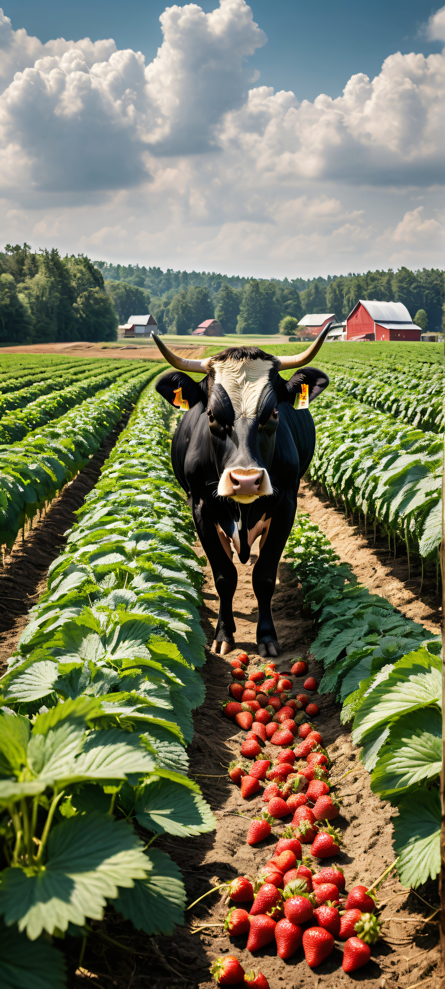 Indulge in the serenity of this breathtaking digital artwork, perfectly optimized for your iPhone, samsung galaxia, or Android home screen. Admire the intricate micro-details of the farm landscape as you gaze upon the cow-sized strawberry, orange, and blueberry, surrounded by the pure void above. A true masterpiece that exudes tranquility and elegance.