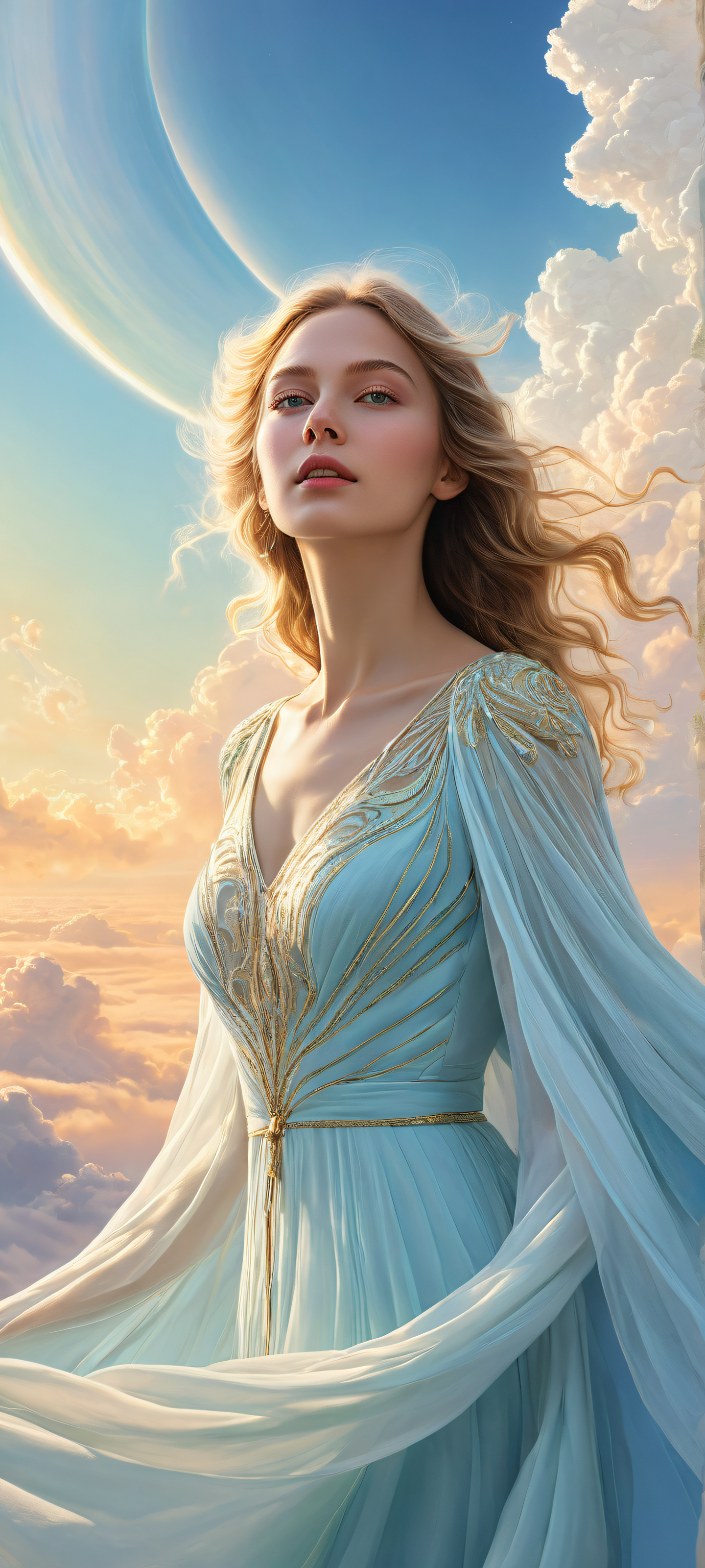 A breathtaking vertical portrait artwork of Aurora, placed in the lower-middle with insane micro-details of swirling clouds and vibrant colors., Perfectly clean and empty top half with vast pure void, gradually giving way to a serene background of subtle gradient., Award-winning digital art, stunning visual impact, pristine clarity., Ethereal lighting with soft, radiant highlights and delicate ray-traced reflections., Pastel hues of pale blue, creamy white, and subtle golden accents., ethereal lighting, radiant, brilliant colors, ray traced reflections, pristine clarity, portrait composition, centered subject in the lower middle, perfectly clean and smooth top half for UI, extreme depth of field blurred background, highly textured surfaces, intricate micro-details, physically based rendering, award-winning digital art, epic breathtaking scale, stunning visual impact, perfect composition, macOS wallpaper aesthetic, masterpiece, 2K QHD resolution, 9:20 aspect ratio.