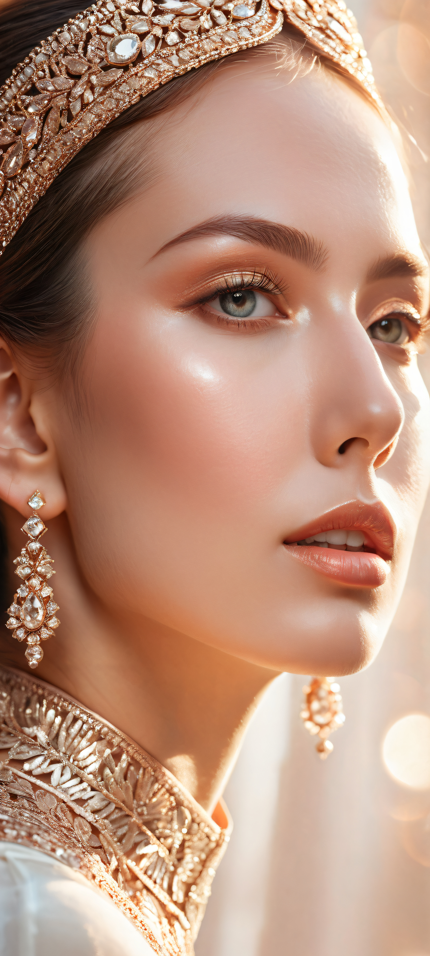 A breathtaking vertical portrait artwork of Beautiful Face placed in the lower-middle with insane intricate micro-details, Perfectly clean and empty top half with vast pure void, vertically-oriented perspective, Award-winning digital art, stunning visual impact, and pristine clarity, Ethereal lighting with radiant brilliant colors, ray-traced reflections, and crystal-clear clarity, [‘Soft Peach’, ‘Creamy White’, ‘Rose Gold’], ethereal lighting, radiant, brilliant colors, ray traced reflections, pristine clarity, portrait composition, centered subject in the lower middle, perfectly clean and smooth top half for UI, extreme depth of field blurred background, highly textured surfaces, intricate micro-details, physically based rendering, award-winning digital art, epic breathtaking scale, stunning visual impact, perfect composition, macOS wallpaper aesthetic, masterpiece, 2K QHD resolution, 9:20 aspect ratio.