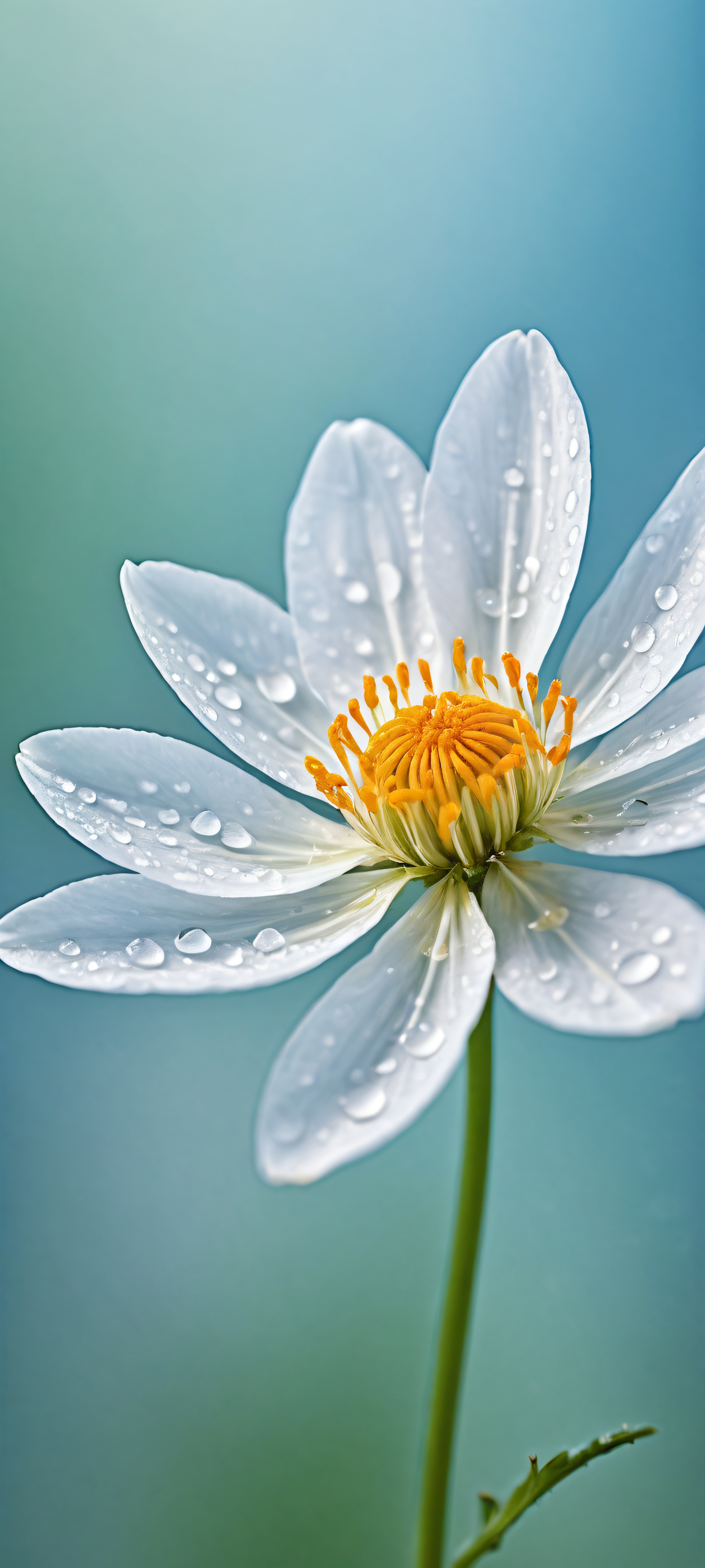 A breathtaking vertical portrait artwork of A delicate flower placed in the lower-middle, intricate micro-details of its petals and stamen are showcased amidst gentle droplets suspended in mid-air., The background is a perfectly clean and empty top half with vast pure void, allowing the subject to take center stage., Award-winning digital art, pristine clarity, with a focus on subtle textures and luminous accents., Dark mode aesthetic prevails, with deep perfect blacks and striking crisp contrast, subtly illuminated by delicate luminescent accents., Dominant colors are soft pastels of pale blue, creamy white, and gentle green, evoking an otherworldly serenity., elegant low-key lighting, deep perfect blacks, striking contrast, sleek dark mode aesthetic, luminescent accents, deep rich colors, portrait composition, centered subject in the lower middle, perfectly clean and smooth top half for UI, extreme depth of field blurred background, highly textured surfaces, intricate micro-details, physically based rendering, award-winning digital art, epic breathtaking scale, stunning visual impact, perfect composition, macOS wallpaper aesthetic, masterpiece, 2K QHD resolution, 9:20 aspect ratio.