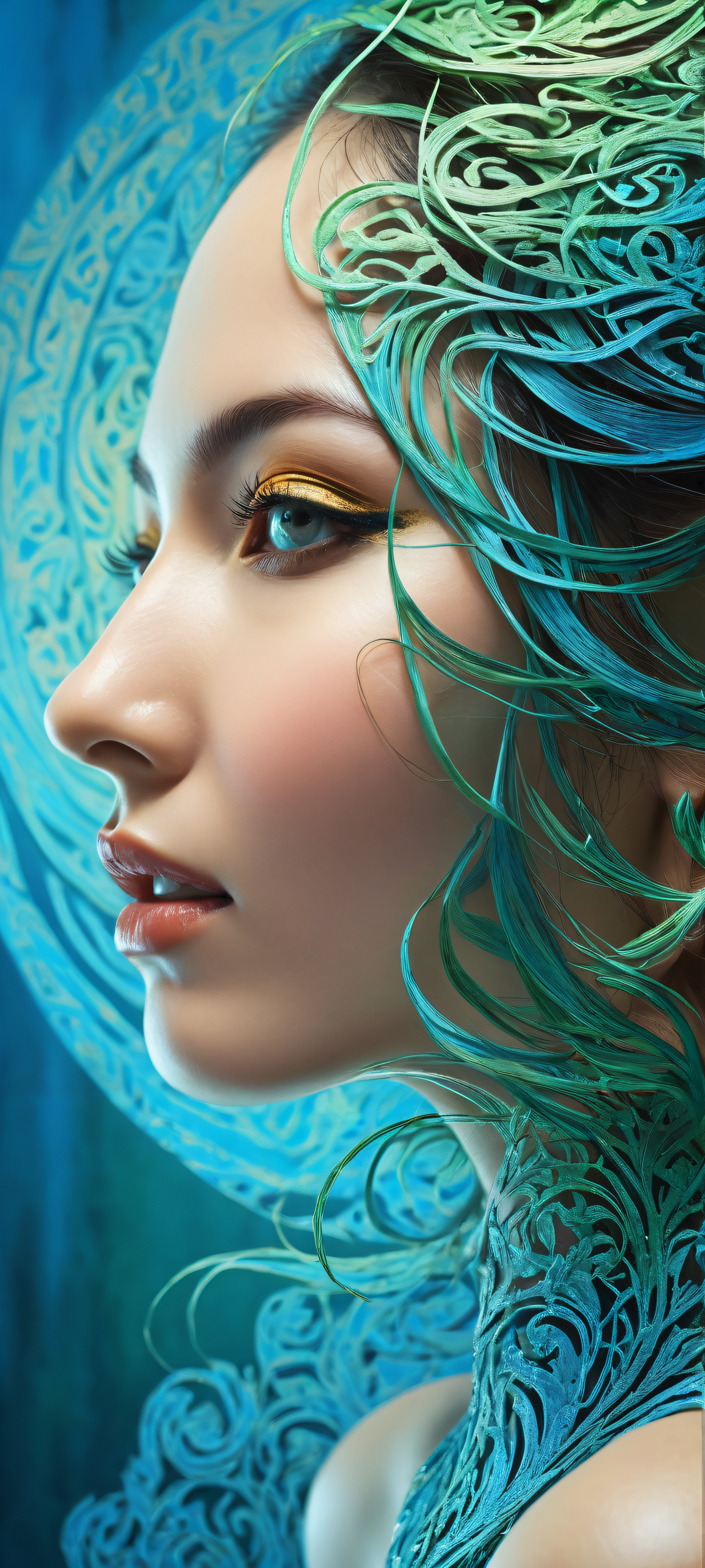 A breathtaking vertical portrait artwork of Delicate Calligraphy placed in the lower-middle, intricate micro-details of traditional media artwork with sharp focus on the swirling patterns., A perfectly clean and empty top half, providing UI breathing space, with a vast pure void below, allowing for a dramatic vertical perspective., Award-winning digital art, stunning visual impact, and pristine clarity, reminiscent of painterly techniques., Ethereal lighting, showcasing radiant colors with ray-traced reflections, creating an airy atmosphere and enhancing the overall mood., Vibrant hues of blue and green, with touches of warm golden highlights, evoking feelings of excitement and energy., ethereal lighting, radiant, brilliant colors, ray traced reflections, pristine clarity, portrait composition, centered subject in the lower middle, perfectly clean and smooth top half for UI, extreme depth of field blurred background, highly textured surfaces, intricate micro-details, physically based rendering, award-winning digital art, epic breathtaking scale, stunning visual impact, perfect composition, macOS wallpaper aesthetic, masterpiece, 2K QHD resolution, 9:20 aspect ratio.