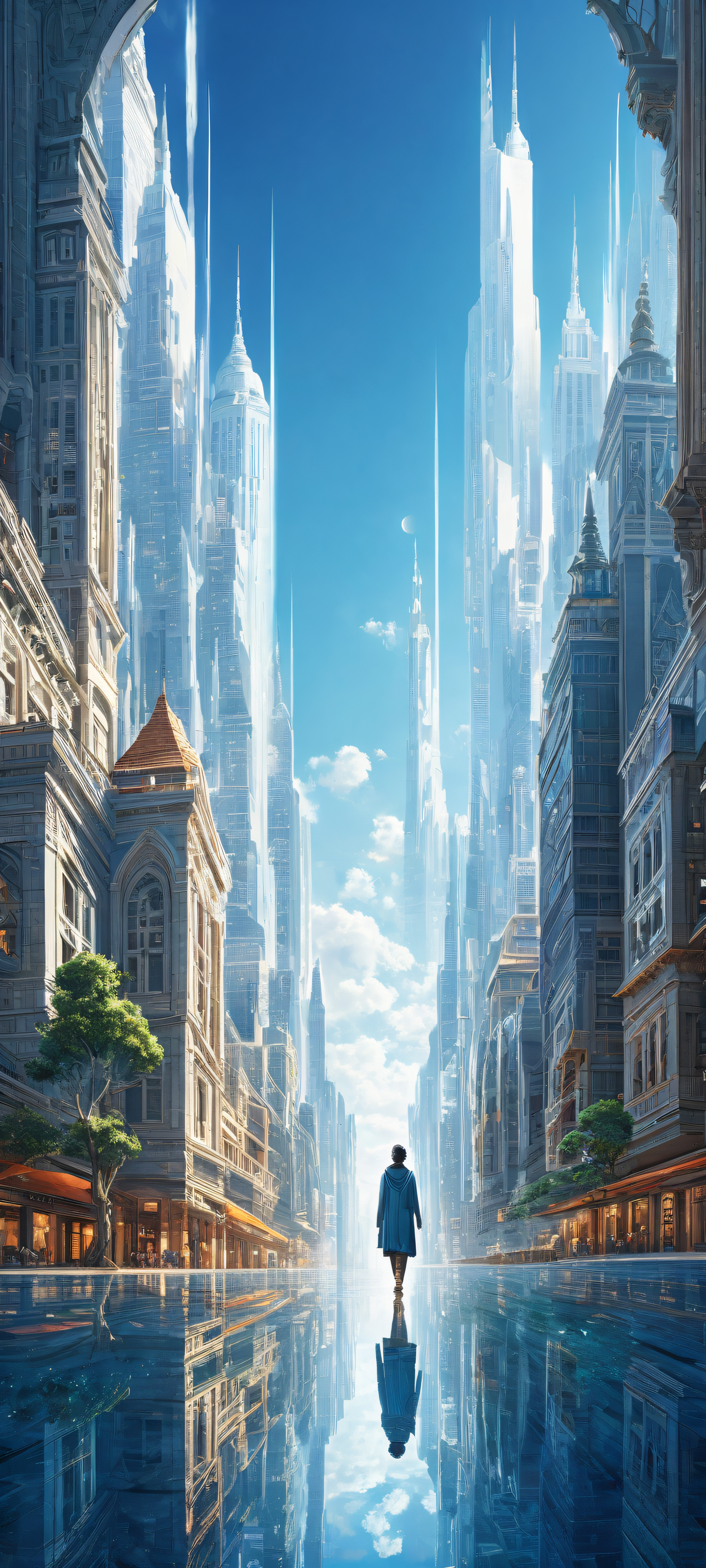 A breathtaking vertical portrait artwork of A majestic cityscape placed in the lower-middle with insane micro-details of intricate architecture and tiny human figures., Perfectly clean and empty top half with vast pure void, gradually transitioning to a vibrant cityscape below., Award-winning digital art, stunning visual impact, featuring cinematic lighting effects and pristine clarity., Ethereal softbox lighting with radiant colors, ray-traced reflections, and exceptional clarity, illuminating the entire scene with an airy feel., A palette of brilliant blues and whites, evoking a sense of serenity and wonder., ethereal lighting, radiant, brilliant colors, ray traced reflections, pristine clarity, portrait composition, centered subject in the lower middle, perfectly clean and smooth top half for UI, extreme depth of field blurred background, highly textured surfaces, intricate micro-details, physically based rendering, award-winning digital art, epic breathtaking scale, stunning visual impact, perfect composition, macOS wallpaper aesthetic, masterpiece, 2K QHD resolution, 9:20 aspect ratio.