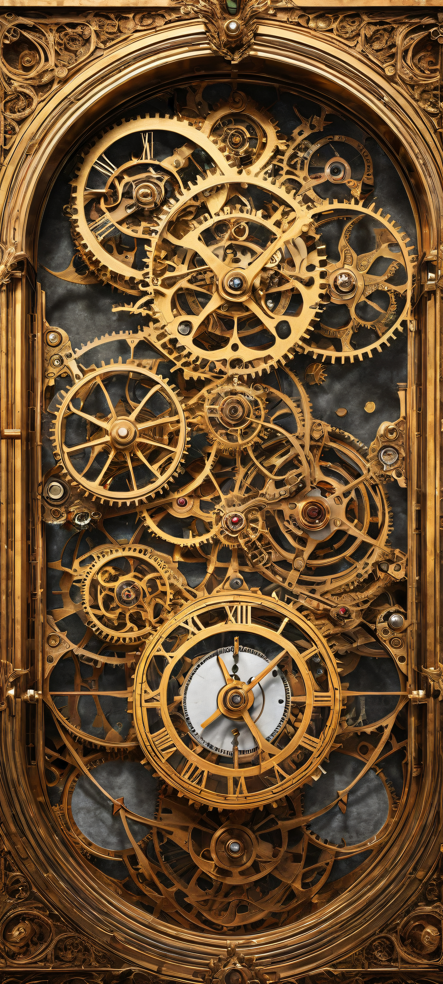 A breathtaking vertical portrait artwork of Antique clockwork mechanisms placed in the lower-middle, intricate micro-details, A perfectly clean and empty top half with vast pure void, gradually transitioning to a secret grotesque fantasy flux below, Award-winning digital art, stunning visual impact, and pristine clarity with Fancha style influences, Ethereal, radiant lighting with brilliant colors, ray-traced reflections, and pristine clarity, evoking a sense of nostalgia, [‘Warm golds and coppers, reminiscent of aged brass’], ethereal lighting, radiant, brilliant colors, ray traced reflections, pristine clarity, portrait composition, centered subject in the lower middle, perfectly clean and smooth top half for UI, extreme depth of field blurred background, highly textured surfaces, intricate micro-details, physically based rendering, award-winning digital art, epic breathtaking scale, stunning visual impact, perfect composition, macOS wallpaper aesthetic, masterpiece, 2K QHD resolution, 9:20 aspect ratio.
