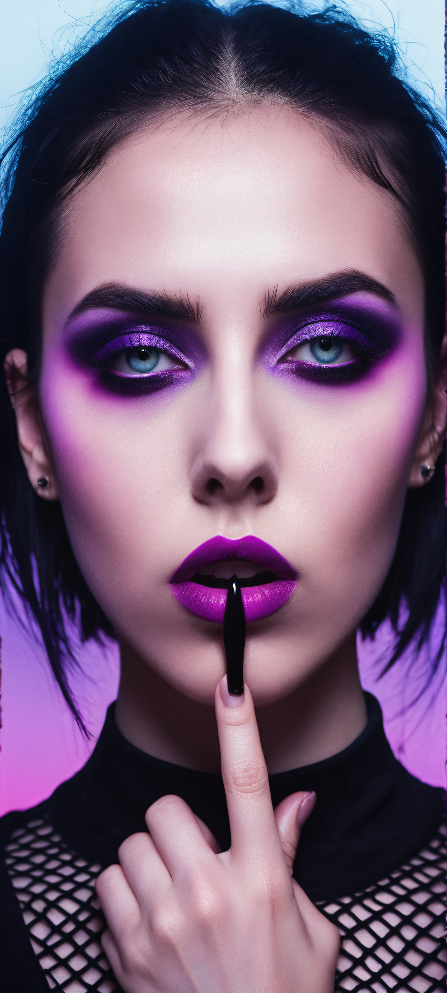 A breathtaking vertical portrait artwork of Abstract portrait of an young goth woman placed in the lower-middle with insane micro-details, her eyes covered with a black, glitched, blurred censor bar, posing with finger at mouth, wearing a black fishnet shirt, Perfectly clean and empty top half with vast pure void, vast purple haze across the fields and old black church in LA backdrop, Award-winning digital art, stunning visual impact, flawless digital masterpiece, absolutely CLEAN, NO AI artifacts, mastered to perfection, Ethereal lighting: radiant, brilliant colors, ray-traced reflections, and pristine clarity, creating an otherworldly atmosphere, Dominant palette inspired by horror cinema, dark blues, deep purples, eerie greens, with splashes of neon pink and black, ethereal lighting, radiant, brilliant colors, ray traced reflections, pristine clarity, portrait composition, centered subject in the lower middle, perfectly clean and smooth top half for UI, extreme depth of field blurred background, highly textured surfaces, intricate micro-details, physically based rendering, award-winning digital art, epic breathtaking scale, stunning visual impact, perfect composition, macOS wallpaper aesthetic, masterpiece, 2K QHD resolution, 9:20 aspect ratio.