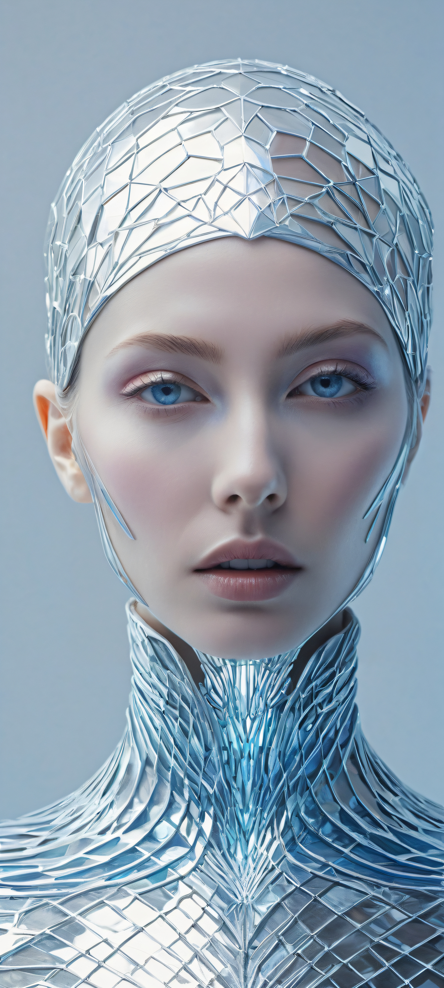 A breathtaking vertical portrait artwork of A breathtaking neofuturistic portrait of an ethereal, gender-neutral figure, placed in the lower-middle with insane micro-details., Perfectly clean and empty top half with vast pure void, emphasizing the silhouette against a stark, monochromatic background., Award-winning digital art, stunning visual impact, and pristine clarity., Ethereal lighting with radiant, brilliant colors, ray-traced reflections, and pristine clarity. Bright and airy., [‘Soothing blues and whites’, ‘Iridescent purples and silvers’], ethereal lighting, radiant, brilliant colors, ray traced reflections, pristine clarity, portrait composition, centered subject in the lower middle, perfectly clean and smooth top half for UI, extreme depth of field blurred background, highly textured surfaces, intricate micro-details, physically based rendering, award-winning digital art, epic breathtaking scale, stunning visual impact, perfect composition, macOS wallpaper aesthetic, masterpiece, 2K QHD resolution, 9:20 aspect ratio.
