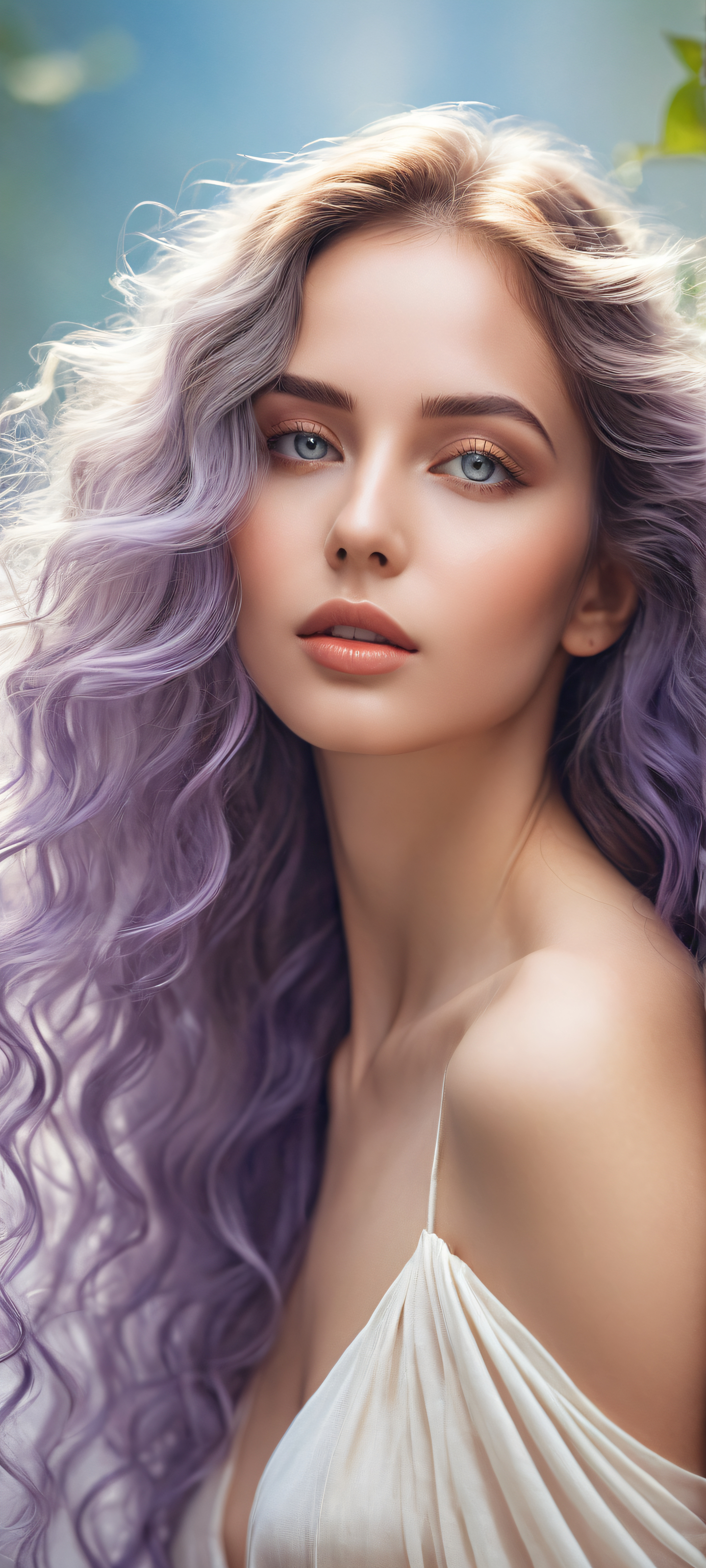 A breathtaking vertical portrait artwork of A beautiful woman with extreme long hair placed in the lower-middle, intricate micro-details, such as defined curls and floating locks., Perfectly clean and empty top half with vast pure void, allowing UI widgets to breathe, while the bottom half is filled with a serene, dreamy atmosphere., Award-winning digital art, stunning visual impact, showcasing pristine clarity and meticulous attention to detail., Ethereal lighting with radiant, brilliant colors, ray traced reflections, and flawless clarity, creating an otherworldly ambiance., Soft pastels, gentle hues of lavender and cream, evoking a sense of serenity and tranquility., ethereal lighting, radiant, brilliant colors, ray traced reflections, pristine clarity, portrait composition, centered subject in the lower middle, perfectly clean and smooth top half for UI, extreme depth of field blurred background, highly textured surfaces, intricate micro-details, physically based rendering, award-winning digital art, epic breathtaking scale, stunning visual impact, perfect composition, macOS wallpaper aesthetic, masterpiece, 2K QHD resolution, 9:20 aspect ratio.