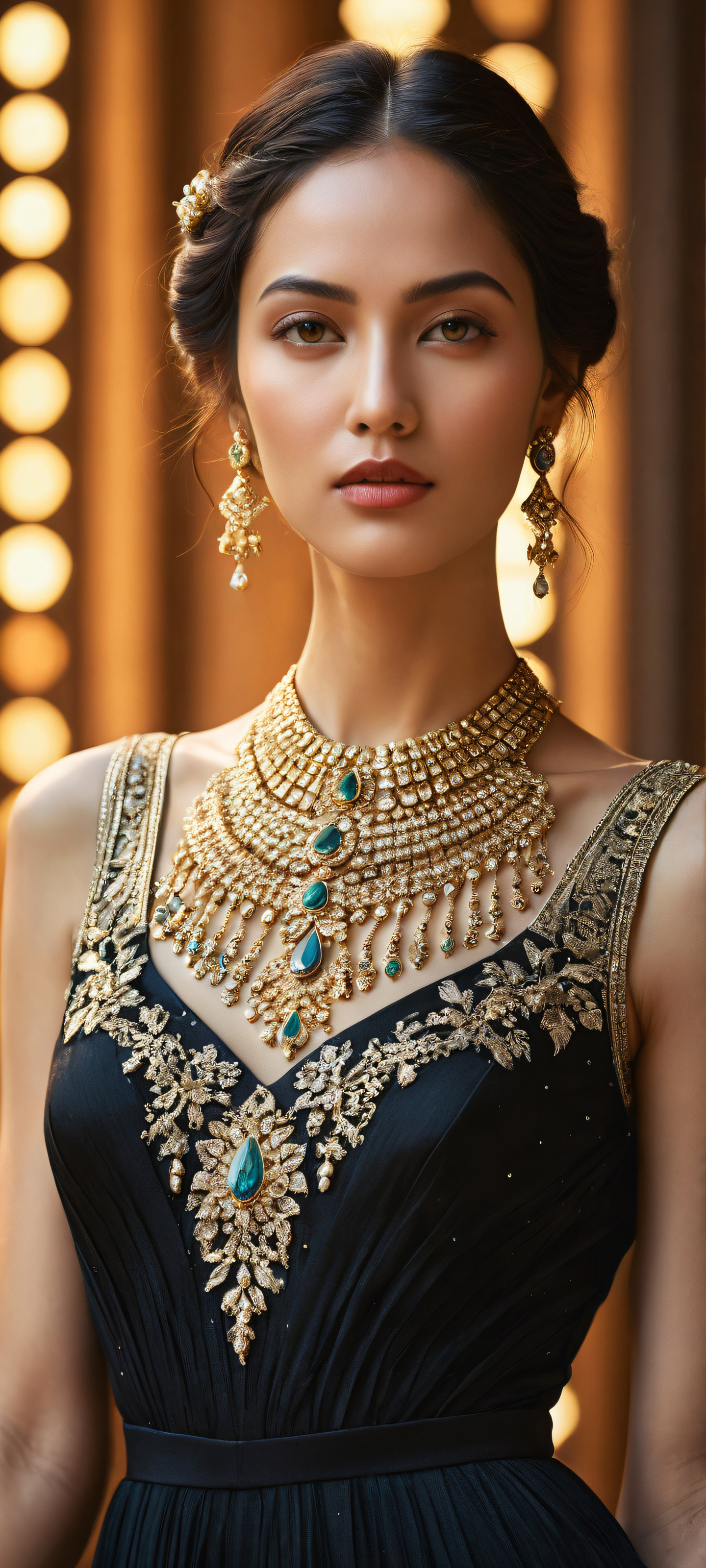 A stunning portrait of a woman with intricate details on her dress and jewelry, perfectly optimized for iPhone/Android home screens.